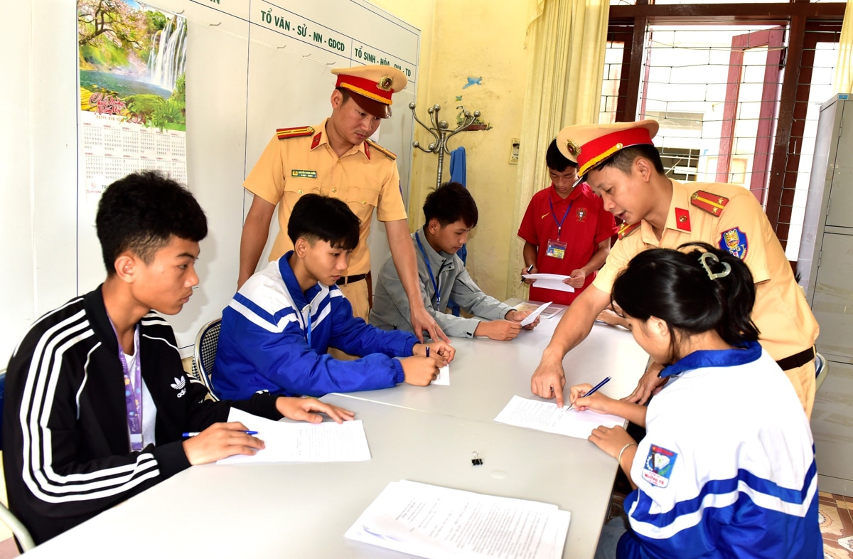 Cán bộ Đội Cảnh sát Giao thông (Công an huyện Mường Tè) hướng dẫn học sinh Trường THPT huyện Mường Tè ký cam kết đảm bảo trật tự an toàn giao thông.