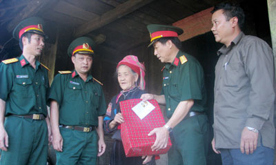 Đại tá Nguyễn Thế Kiên - Phó Bí thư Thường trực Đảng ủy, Chính ủy Bộ CHQS tỉnh tặng quà bà Liều Thị Mùa (vợ liệt sỹ) ở Nà Kế 1, xã Hồng Thu.