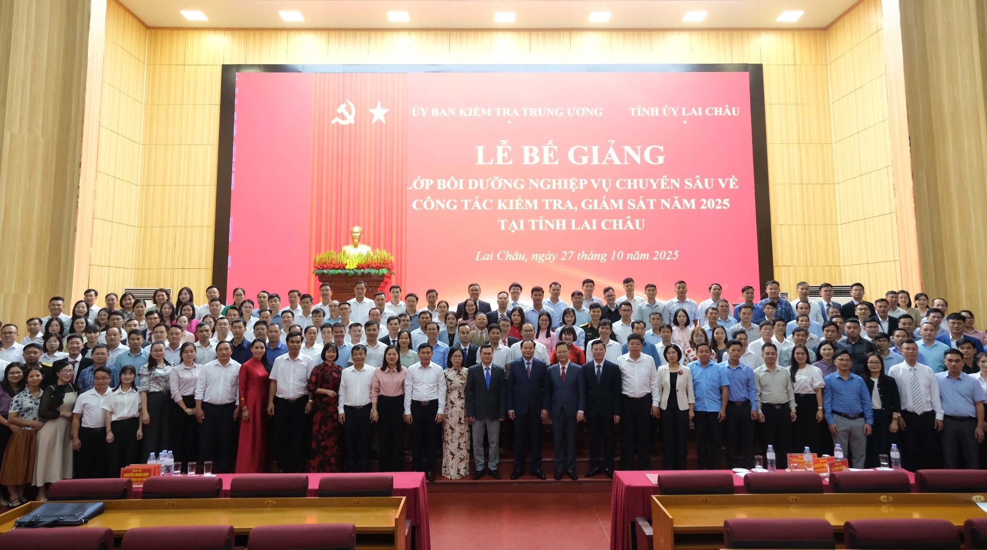 Chiều 27/10, Ủy ban Kiểm tra (UBKT) Trung ương phối hợp với Tỉnh ủy Lai Châu tổ chức lễ bế giảng lớp bồi dưỡng nghiệp vụ chuyên sâu về công tác kiểm tra, giám sát năm 2025.