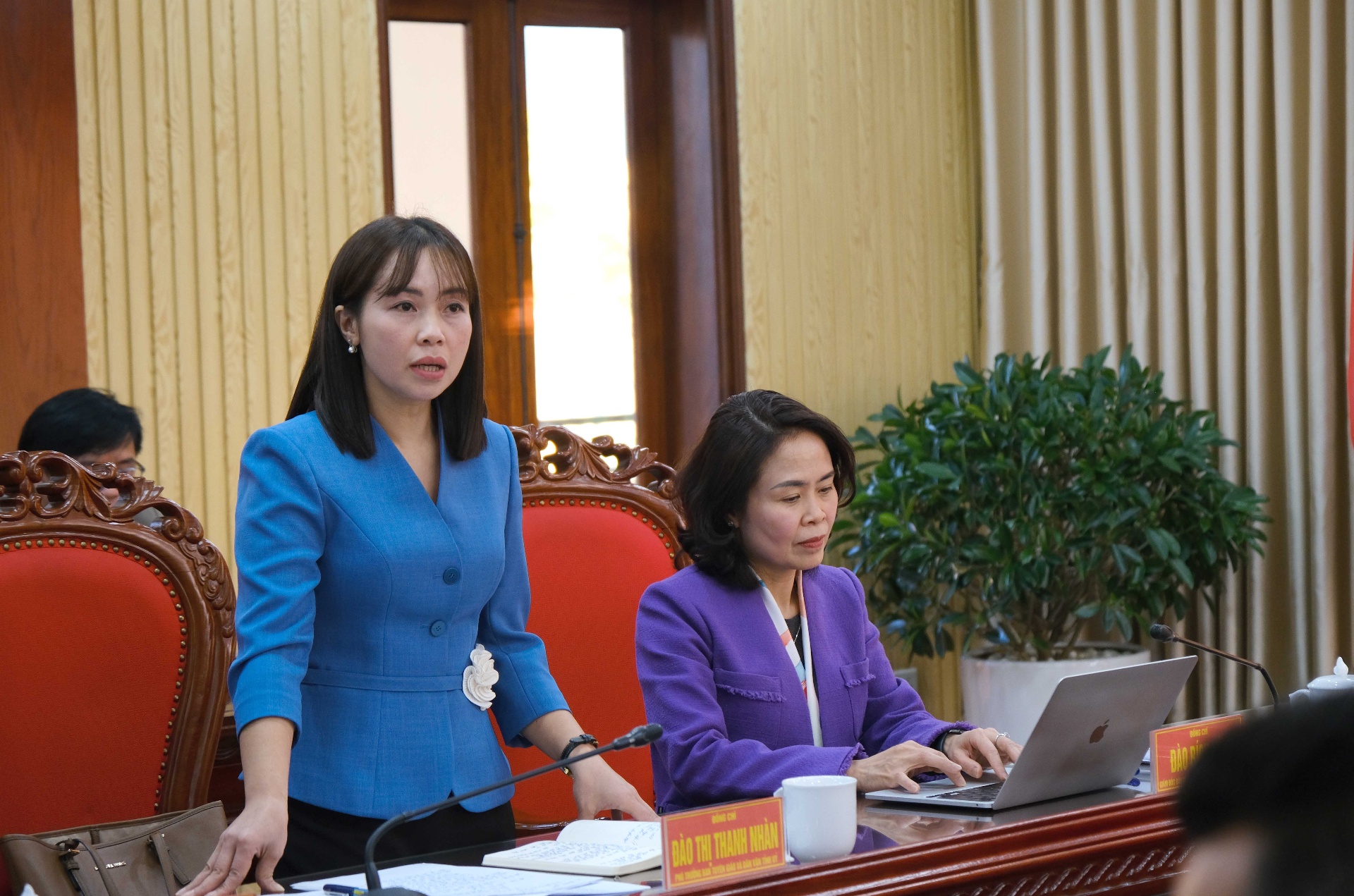 Đồng chí Đào Thị Thanh Nhàn - Phó Trưởng Ban Thường trực Ban Tuyên giáo và Dân vận Tỉnh ủy phát biểu tại buổi gặp mặt.