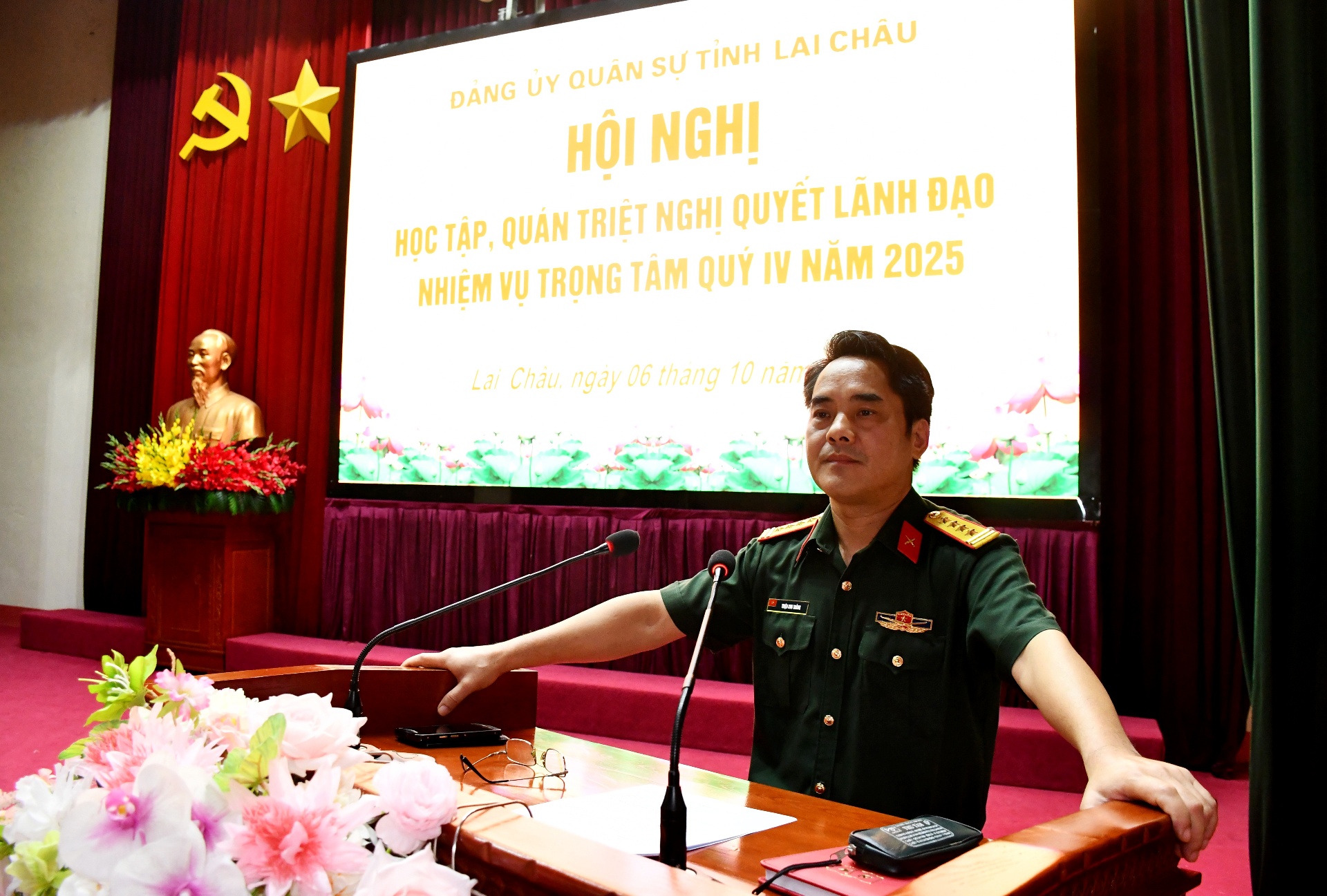 Tại hội nghị, Đại tá Triệu Kim Thắng - Tỉnh ủy viên, Phó Bí thư Thường trực Đảng ủy Quân sự tỉnh, Chính ủy Bộ CHQS tỉnh đã quán triệt đến toàn thể cán bộ, đảng viên về việc phân công trách nhiệm đối với các đồng chí phó Bí thư Thường trực, Phó Bí thư, các đồng chí trong Ban Thường vụ Đảng ủy Quân sự và các đồng chí là đảng ủy viên Đảng ủy Quân sự tỉnh; thông qua quy chế làm việc, quy chế lãnh đạo các mặt công tác trọng yếu; lãnh đạo công tác kiểm tra, giám sát và quy chế làm việc của Uỷ ban Kiểm tra Đảng ủy Quân sự tỉnh kỳ 2025 - 2030; Nghị quyết lãnh đạo thực hiện nhiệm vụ trọng tâm quý IV/2025 của Đảng ủy Quân sự tỉnh.