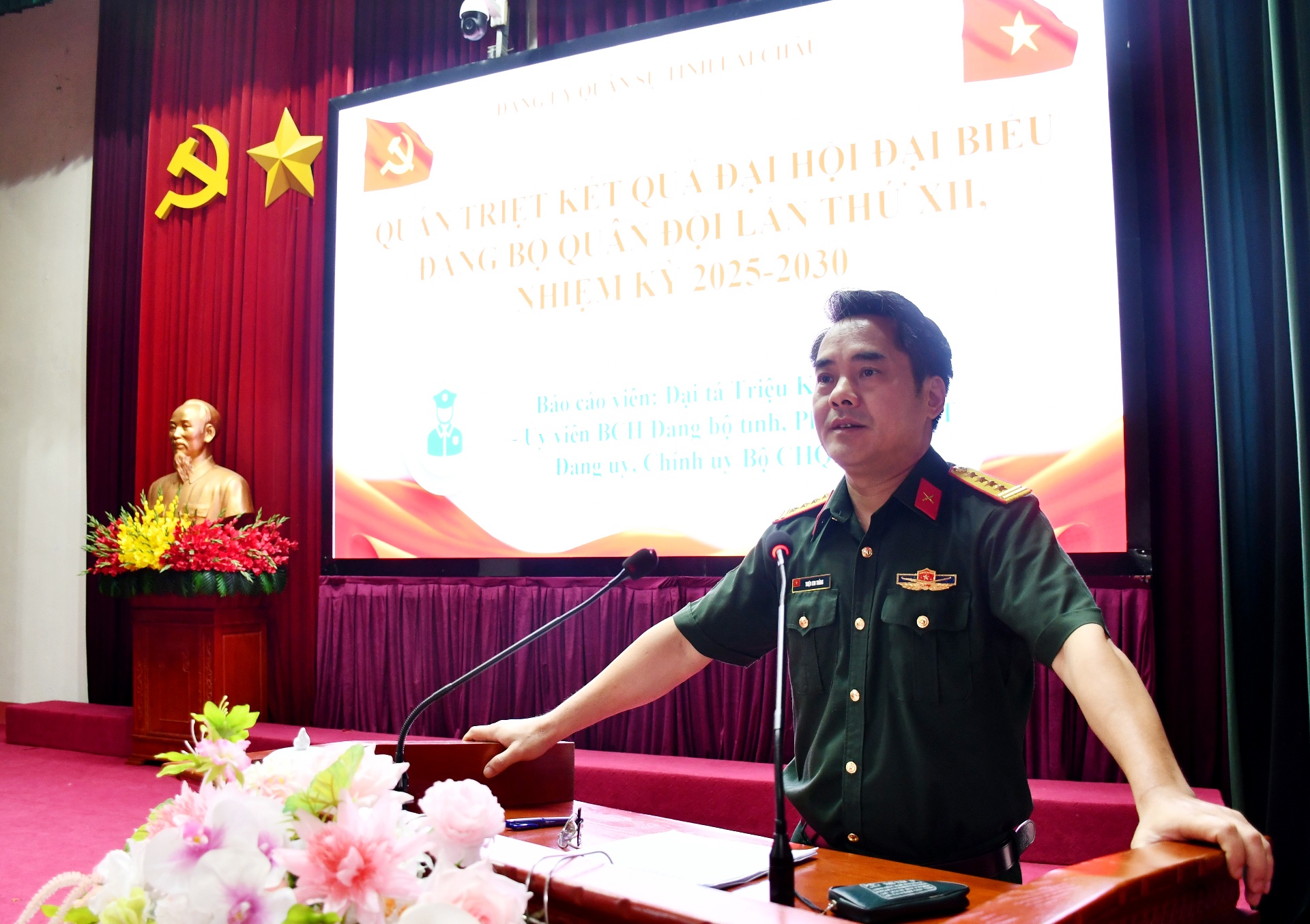 Đại tá Triệu Kim Thắng - Tỉnh ủy viên, Phó Bí thư Thường trực Đảng ủy Quân sự tỉnh, Chính ủy Bộ Chỉ huy Quân sự tỉnh thông báo kết quả Đại hội Đảng bộ Quân đội lần thứ XII, nhiệm kỳ 2025 - 2030.