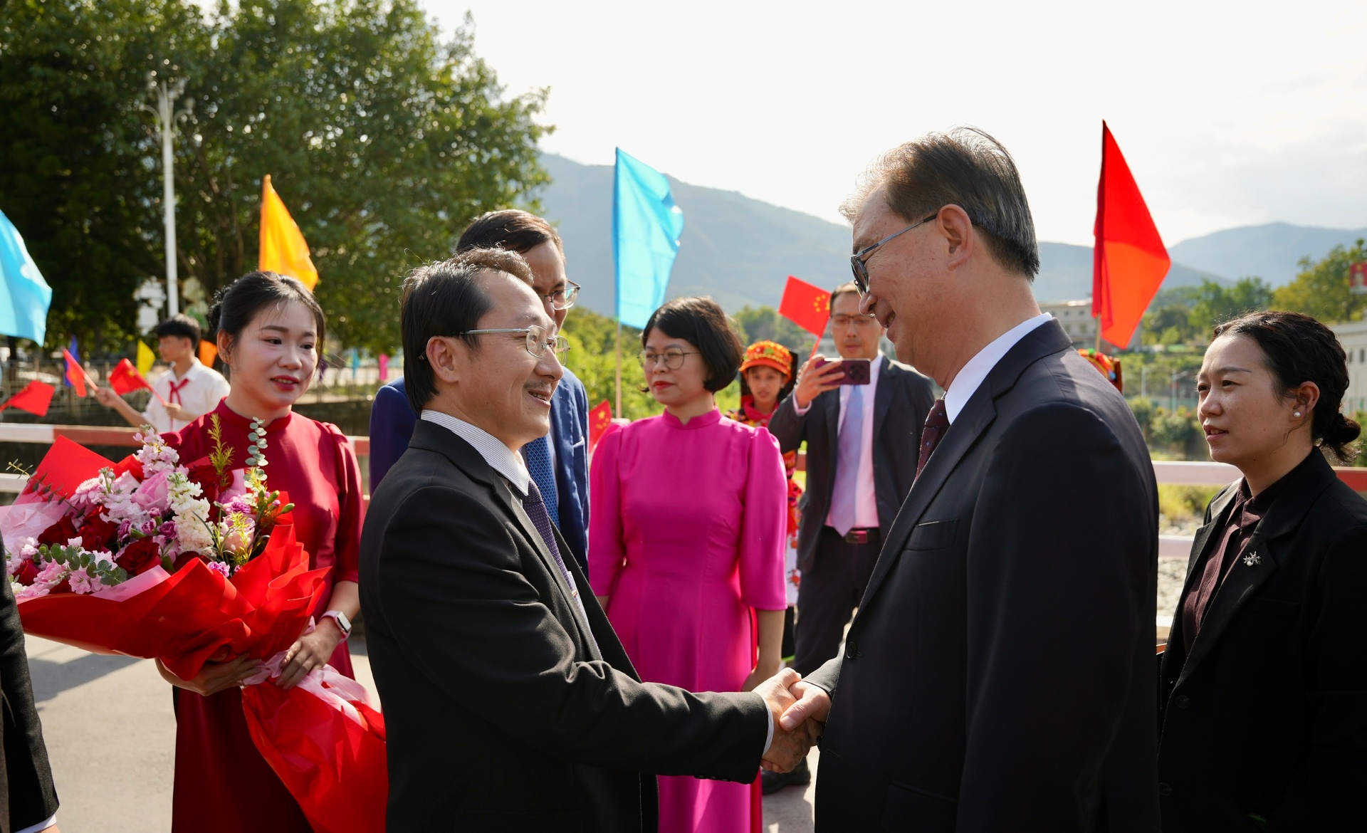 Phó Bí thư Thường trực Tỉnh ủy, Chủ tịch Ủy ban Mặt trận Tổ quốc Việt Nam tỉnh Lai Châu Sùng A Hồ đón Đoàn Đại biểu tỉnh Vân Nam.