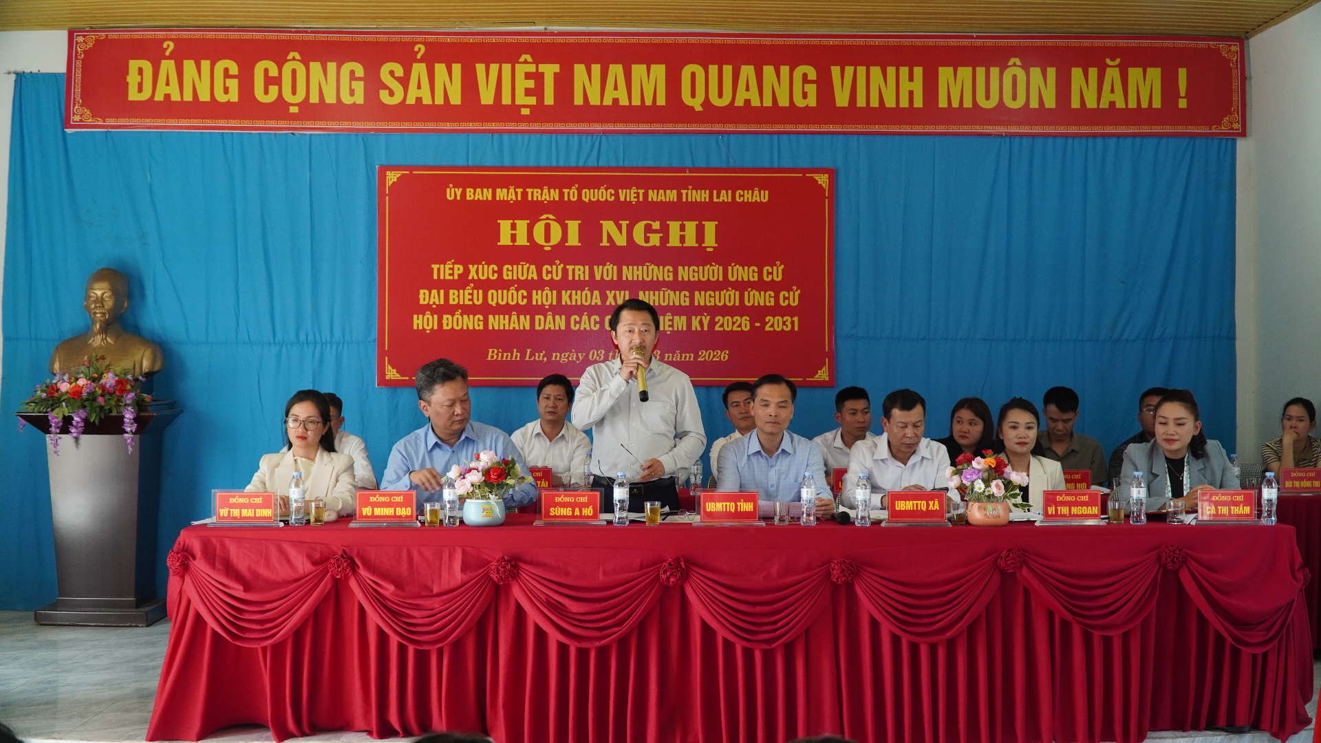 Chiều ngày 3/3, tại bản Thống Nhất, xã Bình Lư, Ủy ban Mặt trận Tổ quốc (UBMTTQ) Việt Nam tỉnh Lai Châu tổ chức Hội nghị tiếp xúc cử tri với những người ứng cử Đại biểu Quốc hội (ĐBQH) khóa XVI và Hội đồng Nhân dân (HĐND) các cấp, nhiệm kỳ 2026-2031, Đơn vị bầu cử số 2. Dự hội nghị có đồng chí Sùng A Hồ - Phó Bí thư Thường trực Tỉnh ủy; các đại biểu ứng cử ĐBQH khóa XVI và HĐND các cấp nhiệm kỳ 2026-2031.