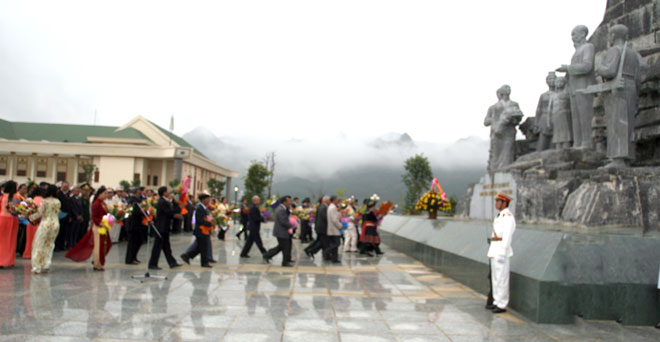 | Các đại biểu dâng hoa tại Tượng đài Bác Hồ với đồng bào các dân tộc Lai Châu. |
