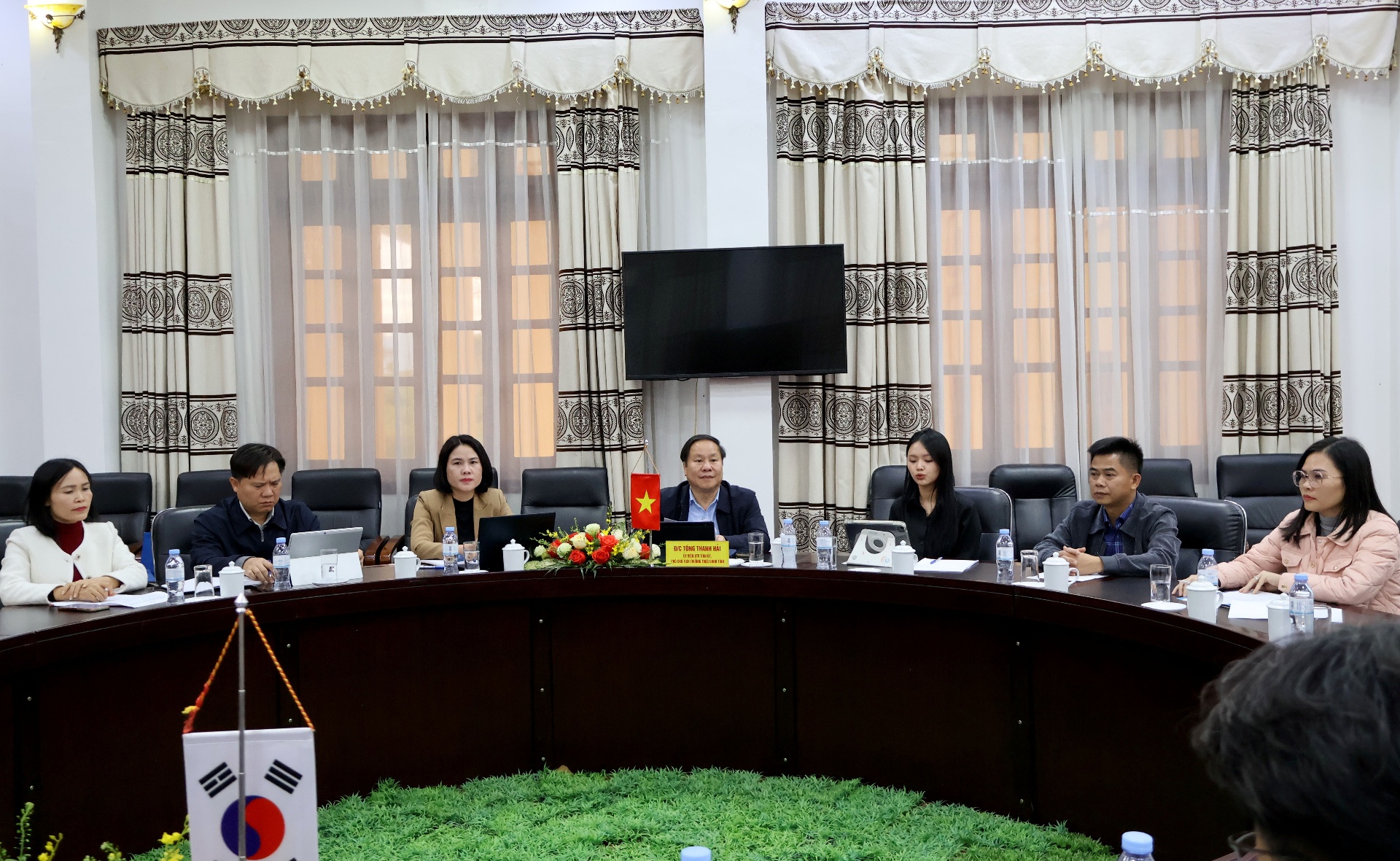 Đồng chí Tống Thanh Hải - Ủy viên Ban Thường vụ Tỉnh ủy, Phó Chủ tịch Thường trực UBND tỉnh trao đổi với Đoàn công tác của chính quyền thành phố Mungyeong.