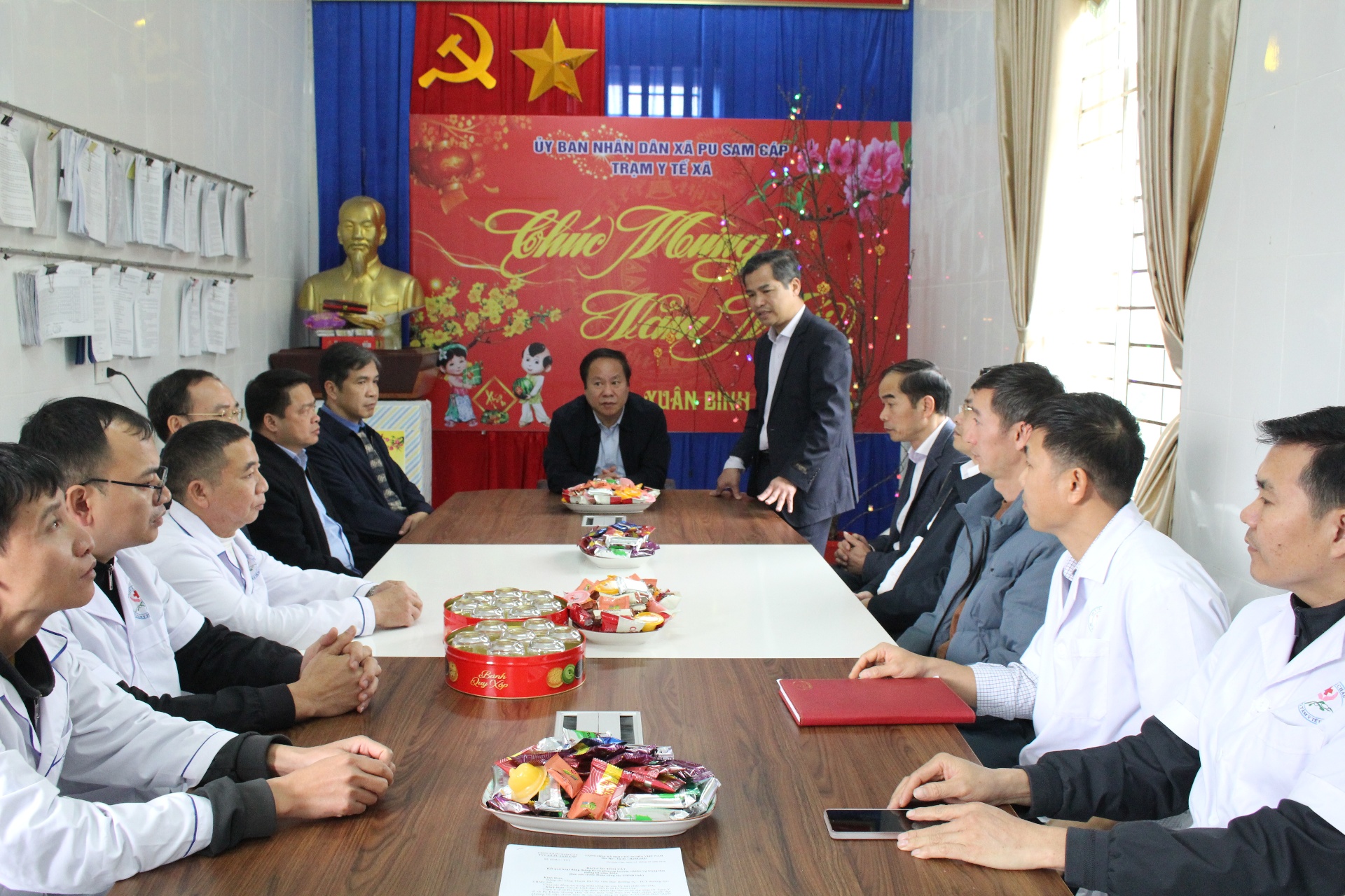 Đồng chí Tống Thanh Hải - Ủy viên Ban Thường vụ Tỉnh ủy, Phó Chủ tịch Thường trực UBND tỉnh chỉ đạo công tác trực tết tại Trạm Y tế xã Pu Sam Cáp.
