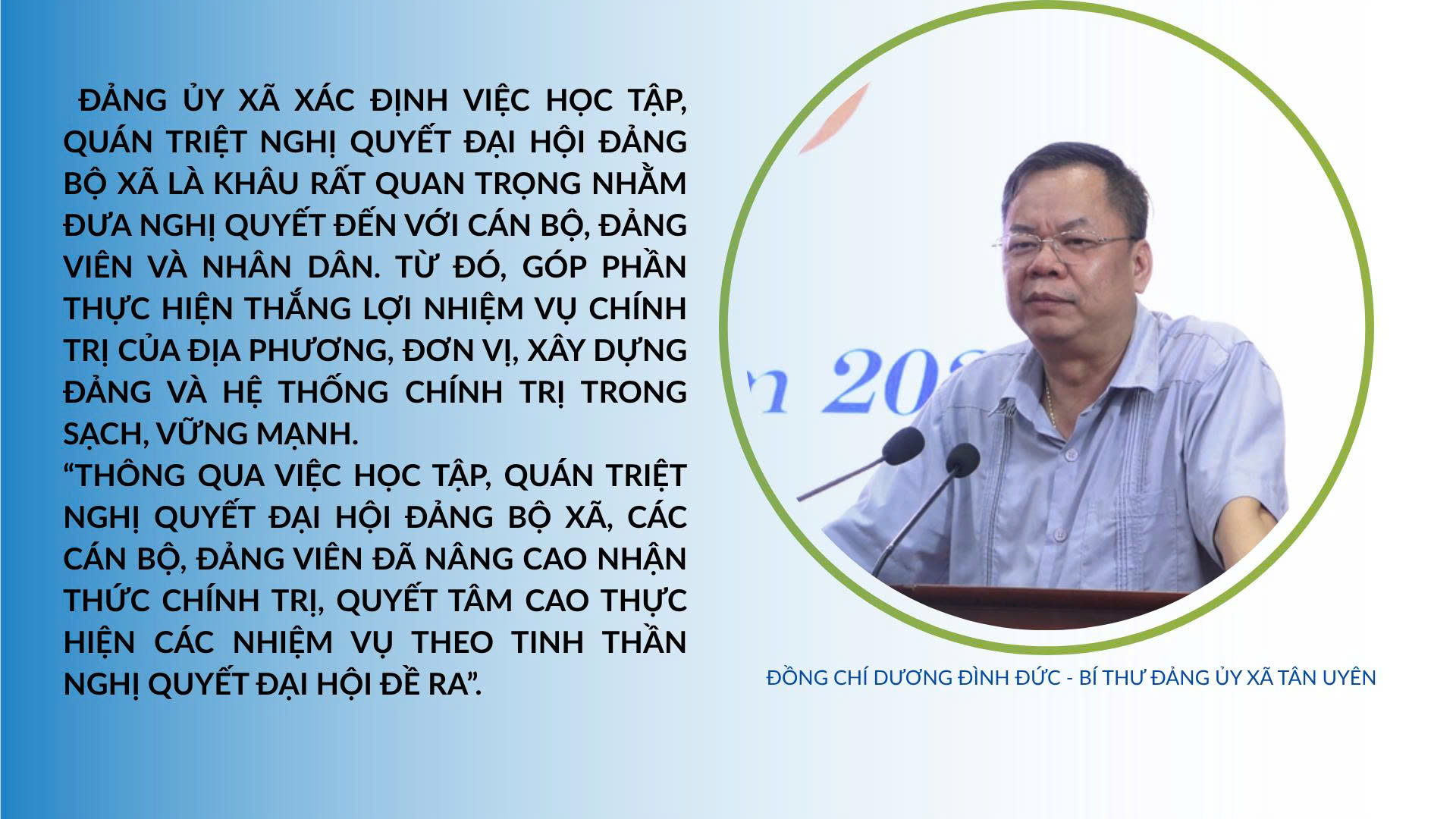 Sau hợp nhất, Đảng bộ xã Tân Uyên có 71 chi, đảng bộ trực thuộc và 1.570 đảng viên. Từ đầu tháng 10, Đảng ủy xã đã tổ chức các hội nghị học tập, quán triệt Nghị quyết Đại hội Đại biểu Đảng bộ xã lần thứ I, nhiệm kỳ 2025-2030 tới cán bộ, công chức, viên chức, các cơ quan, đơn vị, các chi, đảng bộ trực thuộc trên địa bàn xã. Thông qua đó giúp cán bộ, đảng viên nâng cao nhận thức chính trị, quyết tâm cao thực hiện các nhiệm vụ theo tinh thần Nghị quyết Đại hội đề ra.
