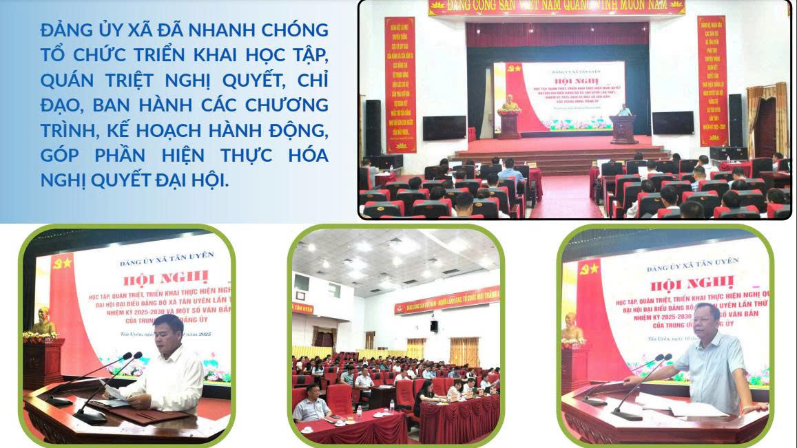 Ngay sau khi Đại hội Đại biểu Đảng bộ xã Tân Uyên lần thứ I, nhiệm kỳ 2025 - 2030 thành công, Đảng ủy xã đã nhanh chóng tổ chức triển khai học tập, quán triệt nghị quyết, chỉ đạo, ban hành các chương trình, kế hoạch hành động, đưa Nghị quyết vào cuộc sống.