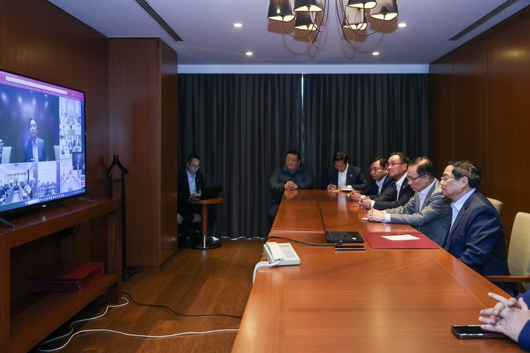 Thủ tướng Phạm Minh Chính chủ trì cuộc họp khẩn trực tuyến từ Algeria với lãnh đạo các bộ ngành, cơ quan, địa phương về tình hình và các giải pháp cấp bách ứng phó mưa lũ, thiên tai trên địa bàn một số tỉnh miền Trung - (Ảnh: VGP/Nhật Bắc)