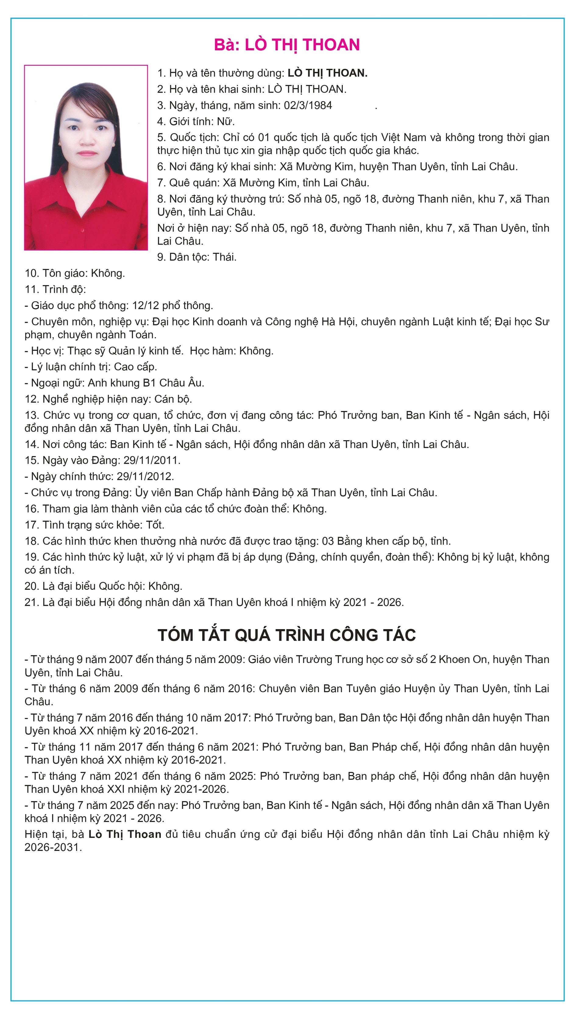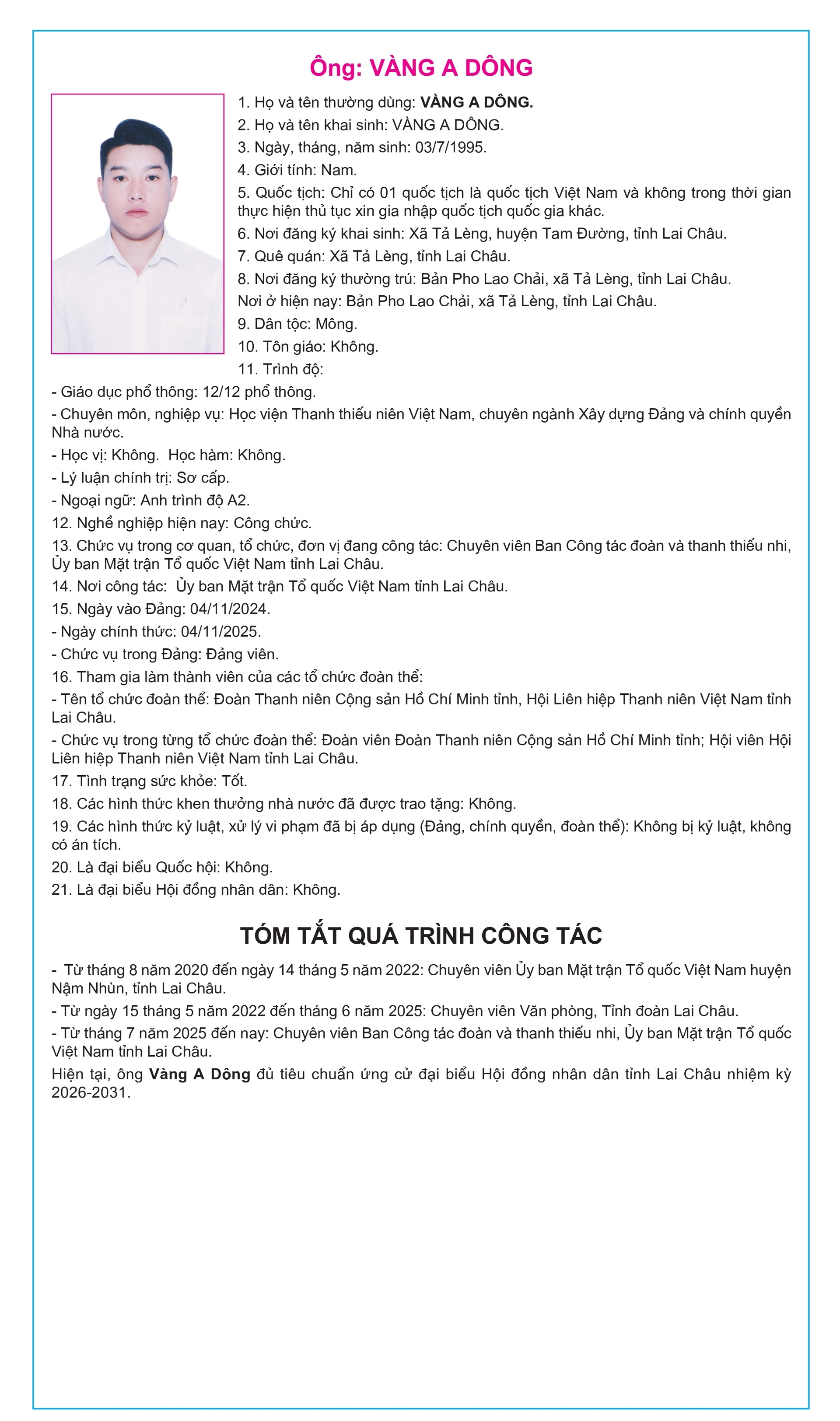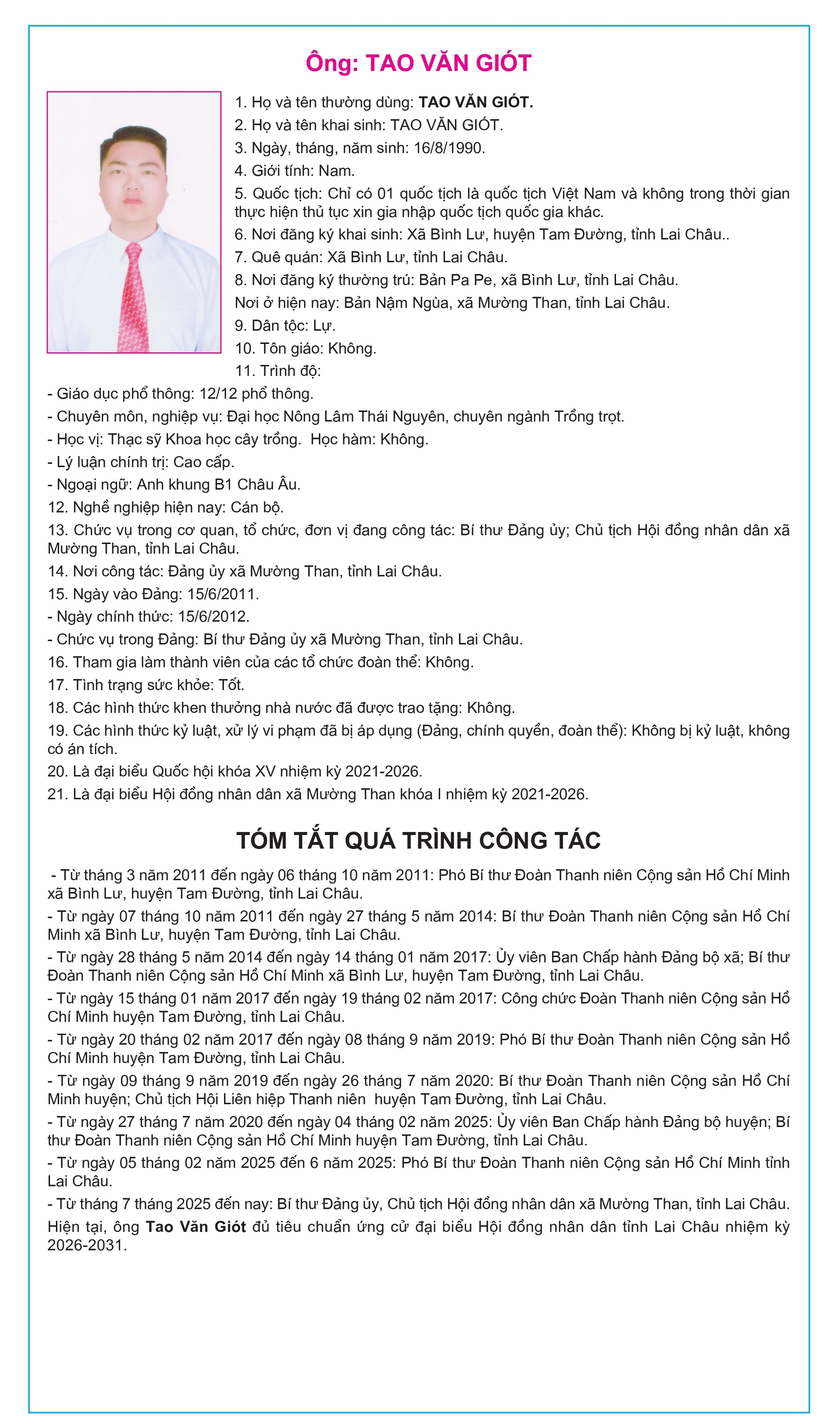 Tiểu sử tóm tắt của người ứng cử Đại biểu Hội đồng Nhân dân tỉnh Lai Châu, nhiệm kỳ 2026-2031