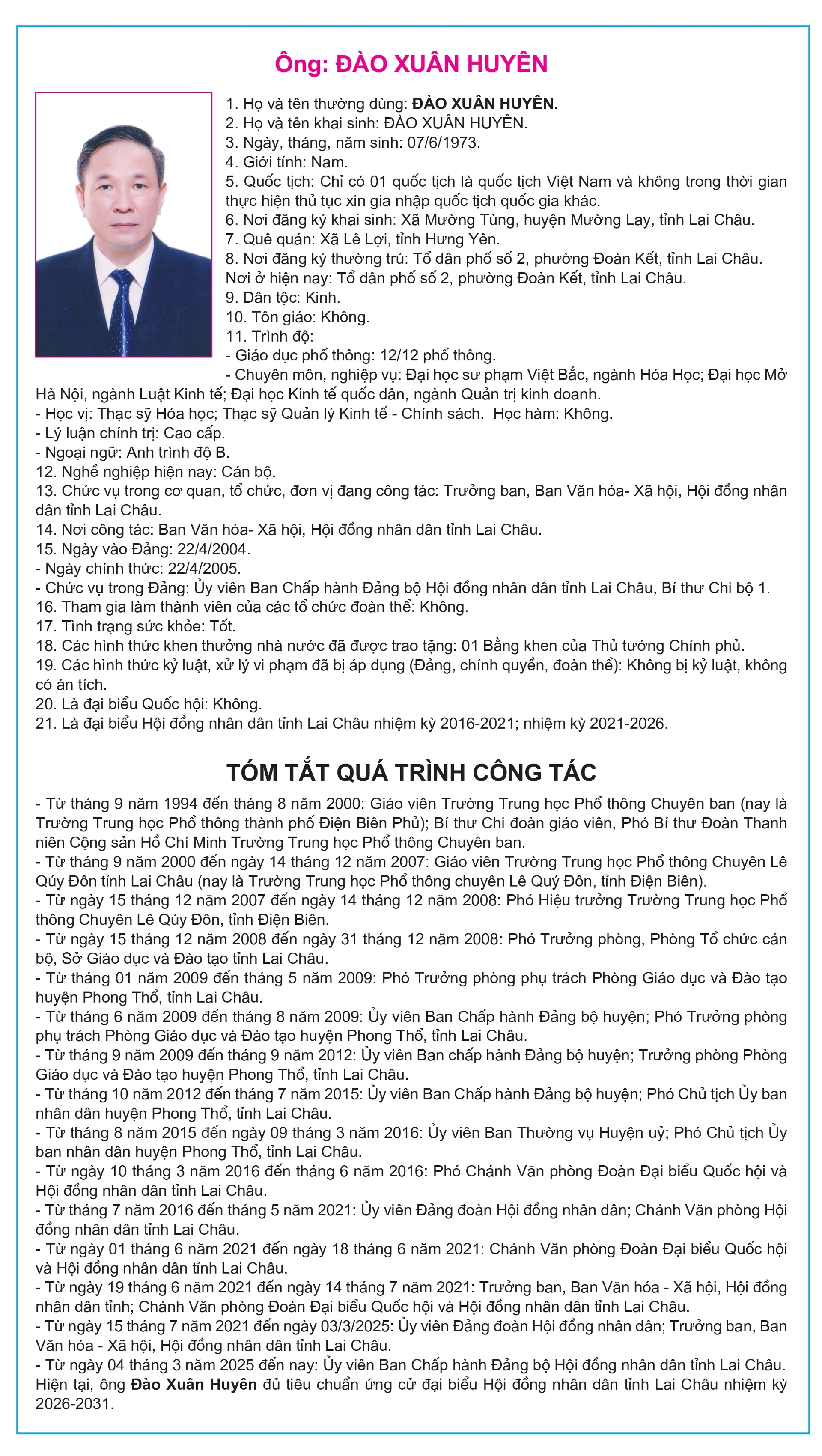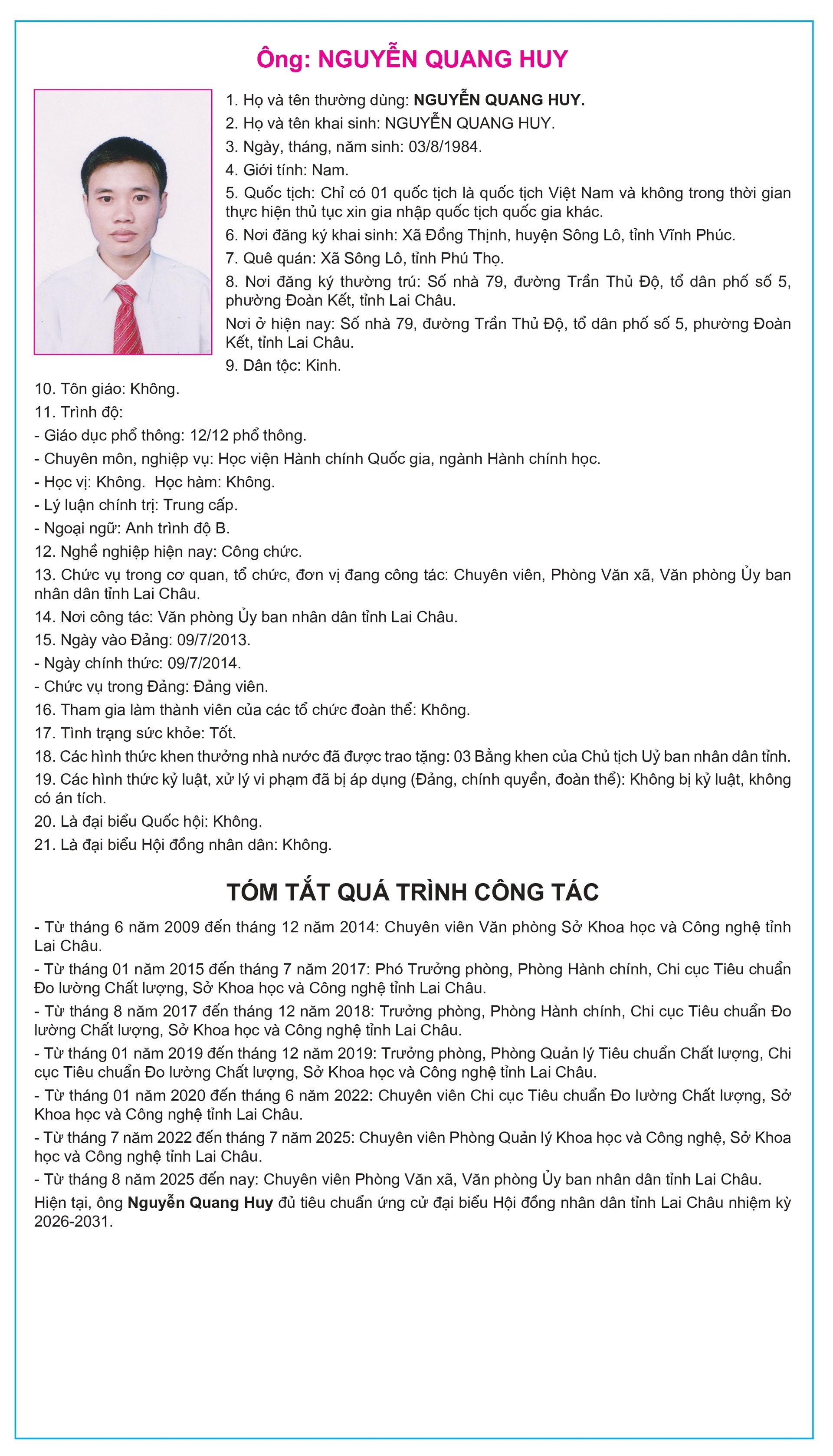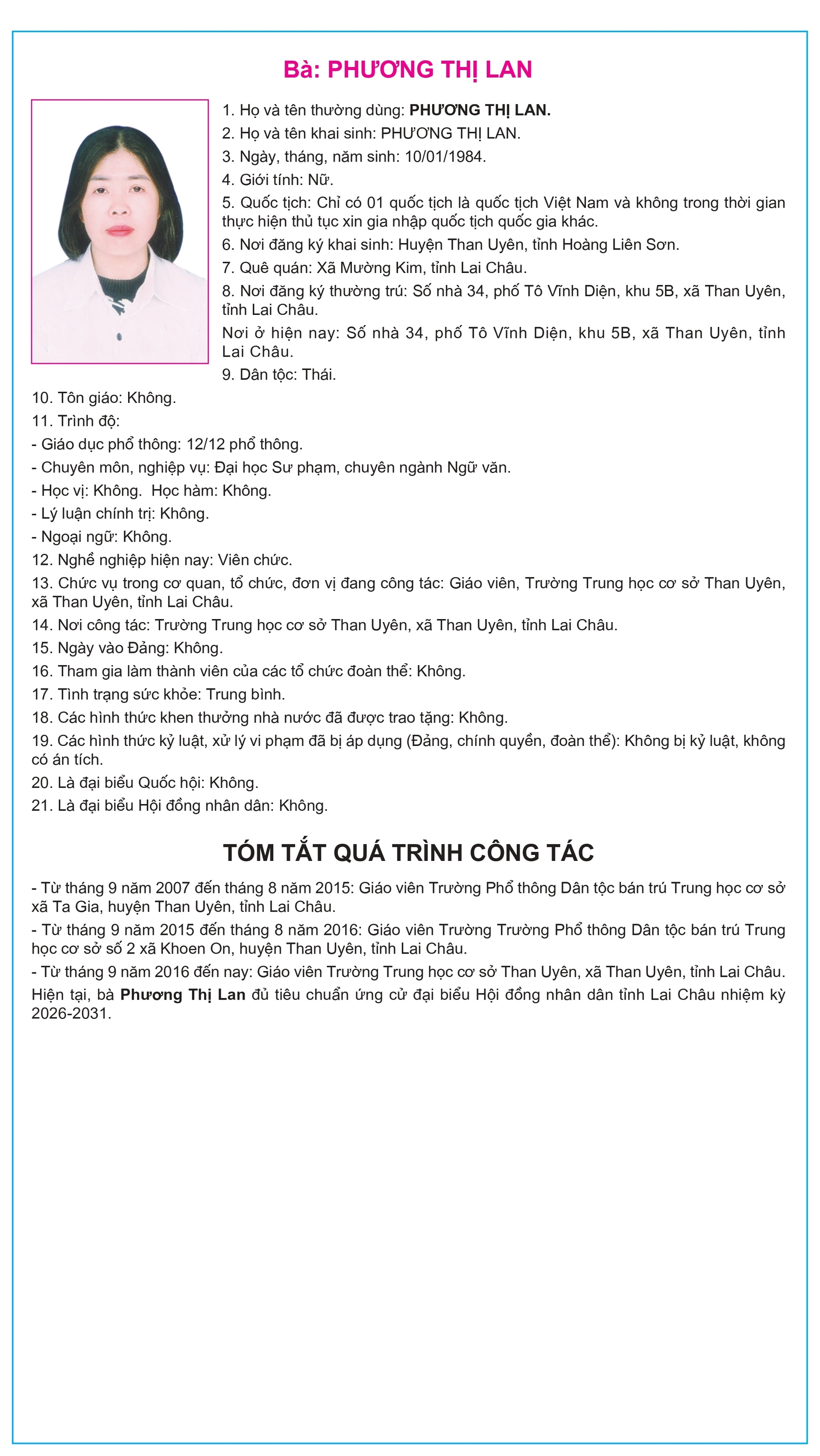 Tiểu sử tóm tắt của người ứng cử Đại biểu Hội đồng Nhân dân tỉnh Lai Châu, nhiệm kỳ 2026-2031