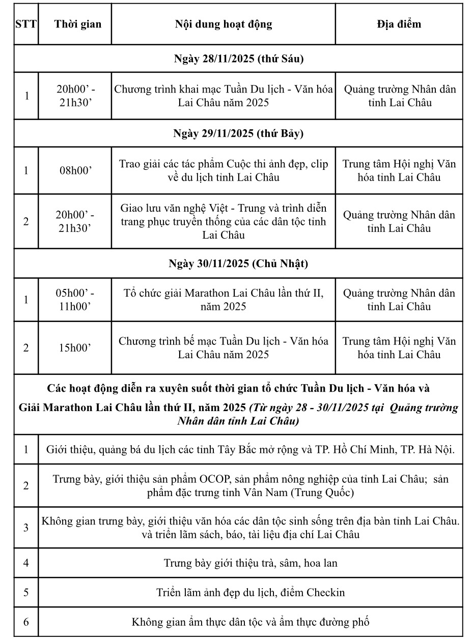 Tuần Du lịch - Văn hóa và Giải Marathon Lai Châu lần thứ II, năm 2025 tổ chức với các hoạt động chính sau: