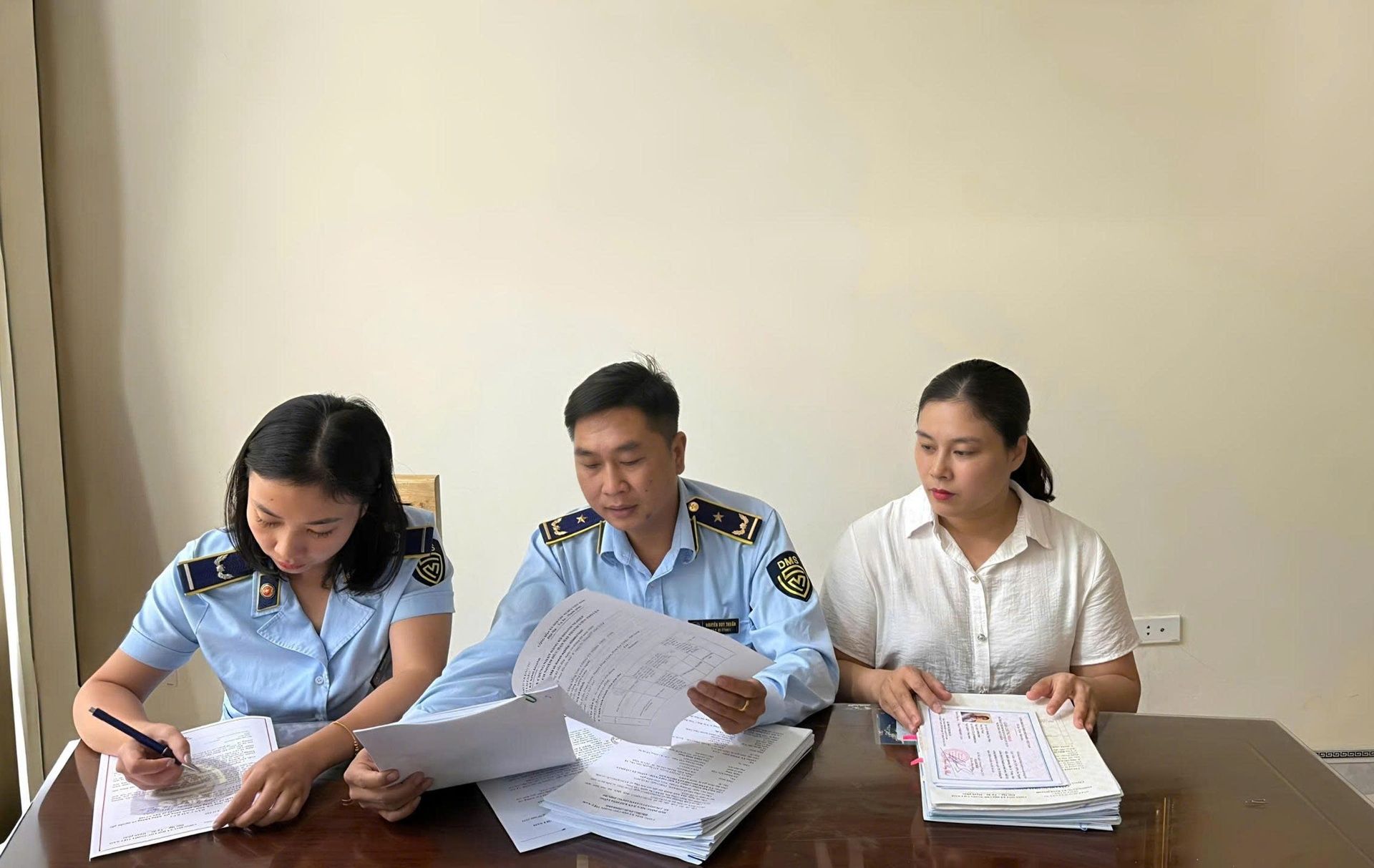 Cán bộ Đội Quản lý thị trường số 3 kiểm tra hồ sơ, giấy tờ liên quan đến hoạt động kinh doanh của Công ty TNHH DHV - GAS (khu 10, xã Than Uyên).