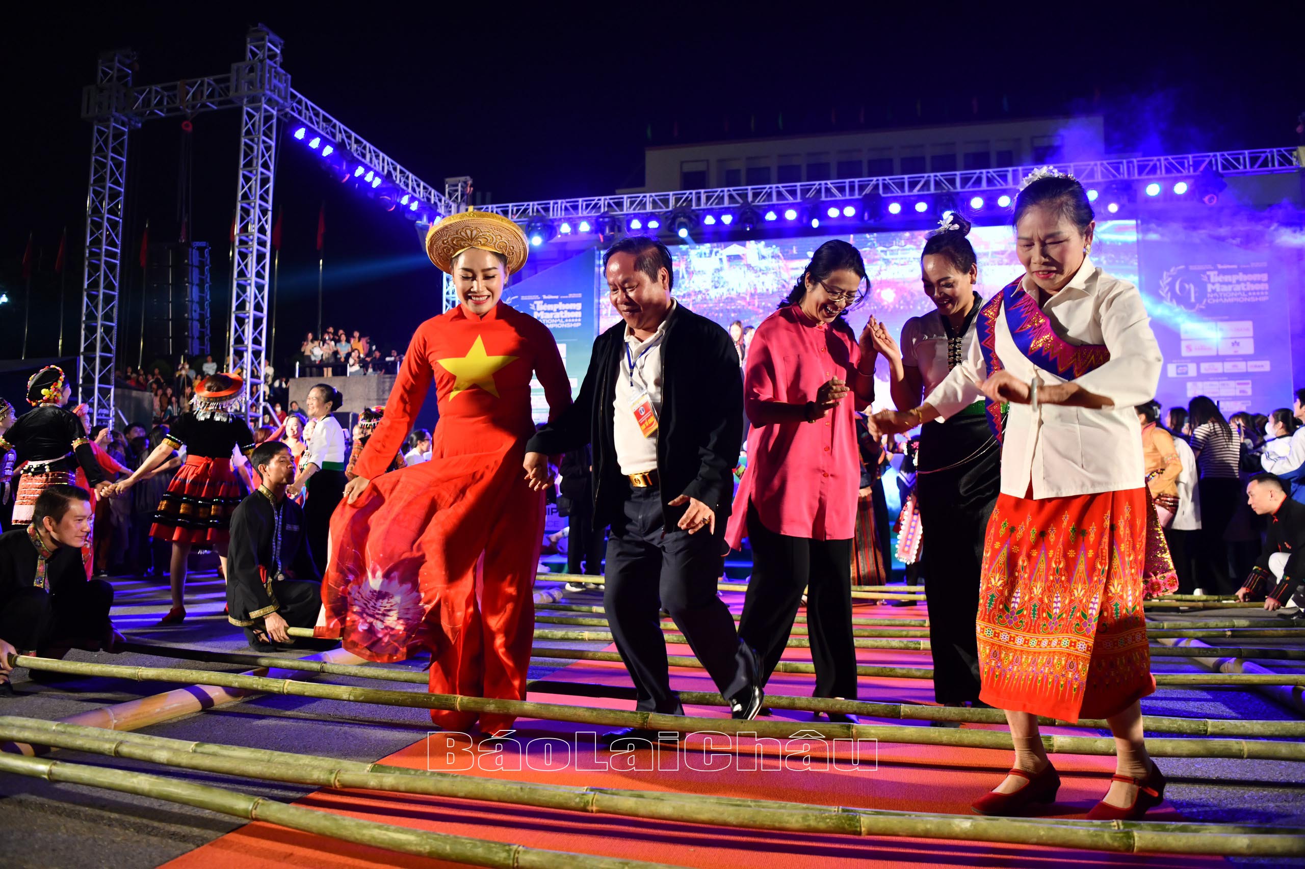 Các đại biểu cùng hoà mình vào vòng xoè đoàn kết với các diễn viên và Nhân dân.