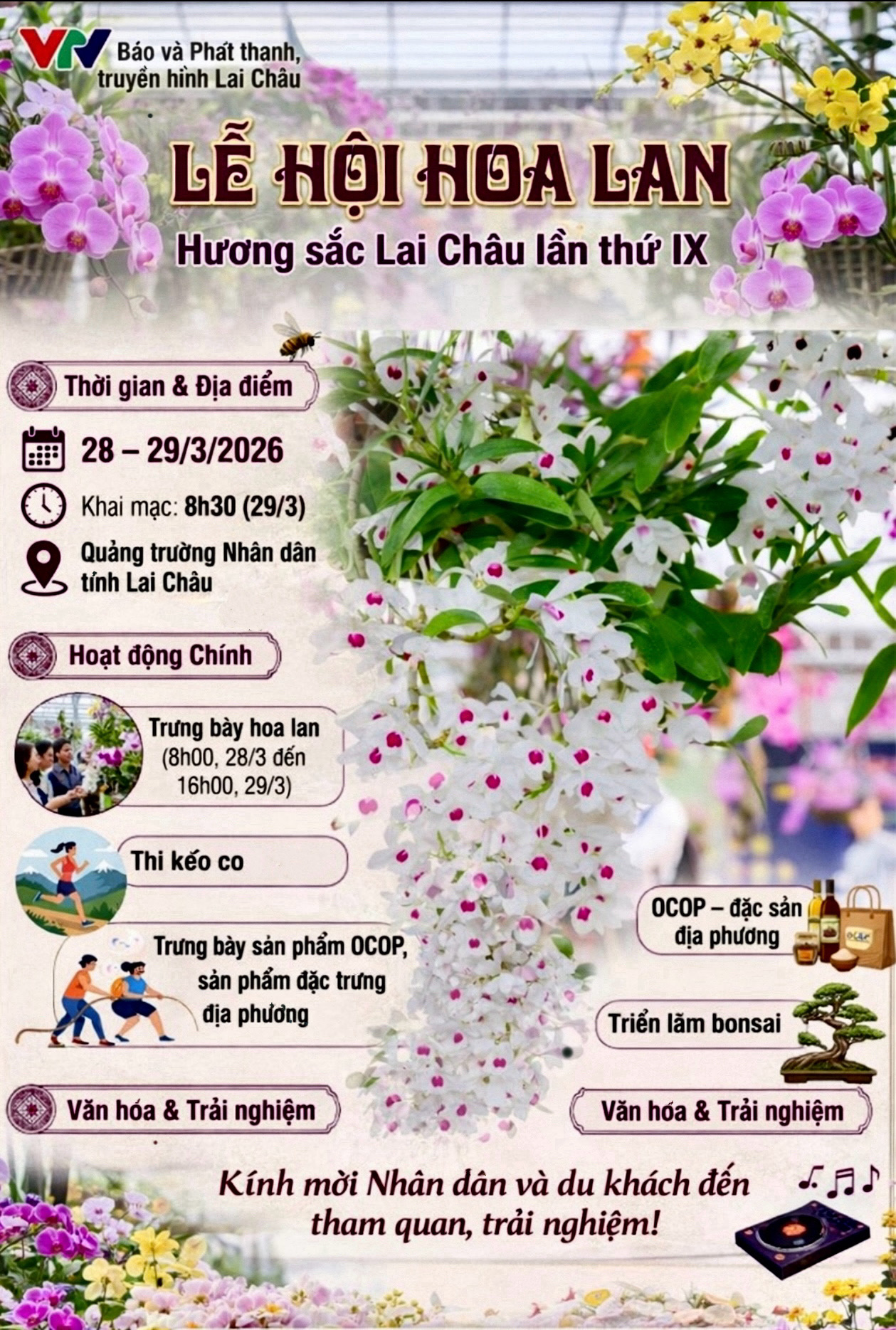 Lễ hội Hoa lan – Hương sắc Lai Châu lần thứ 9 sẽ diễn ra tại Quảng trường Nhân dân tỉnh Lai Châu với nhiều hoạt động phong phú, đặc sắc, góp phần tôn vinh vẻ đẹp hoa lan, góp phần lan tỏa hình ảnh Lai Châu – điểm đến hấp dẫn, đậm đà bản sắc văn hóa các dân tộc.