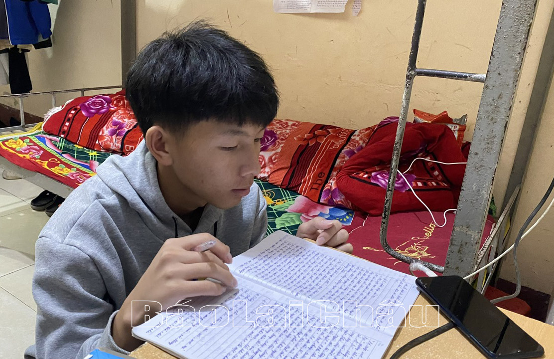 Em Sùng A Phìn ôn bài trước ngày diễn ra Kỳ thi tốt nghiệp THPT năm 2023.