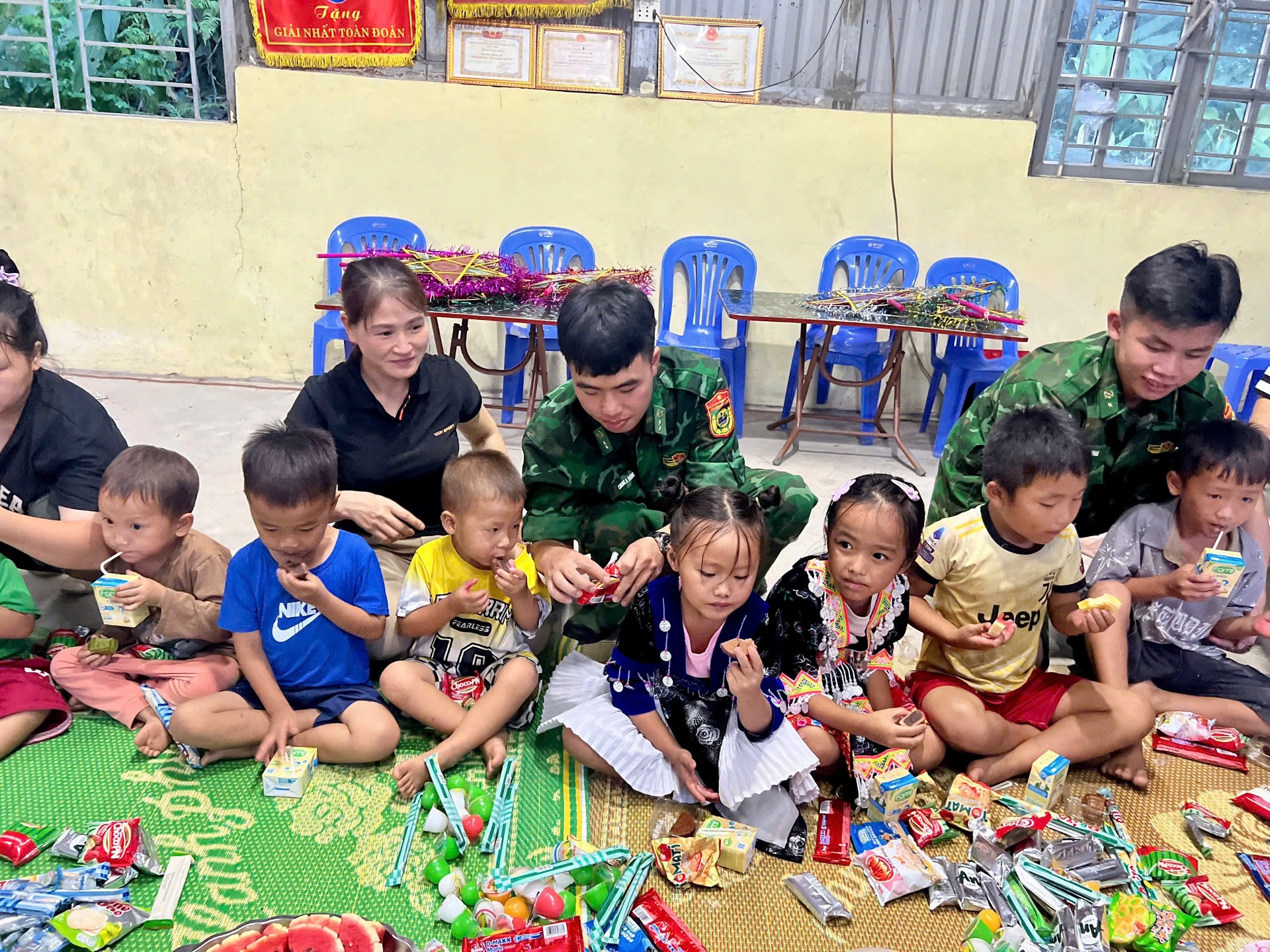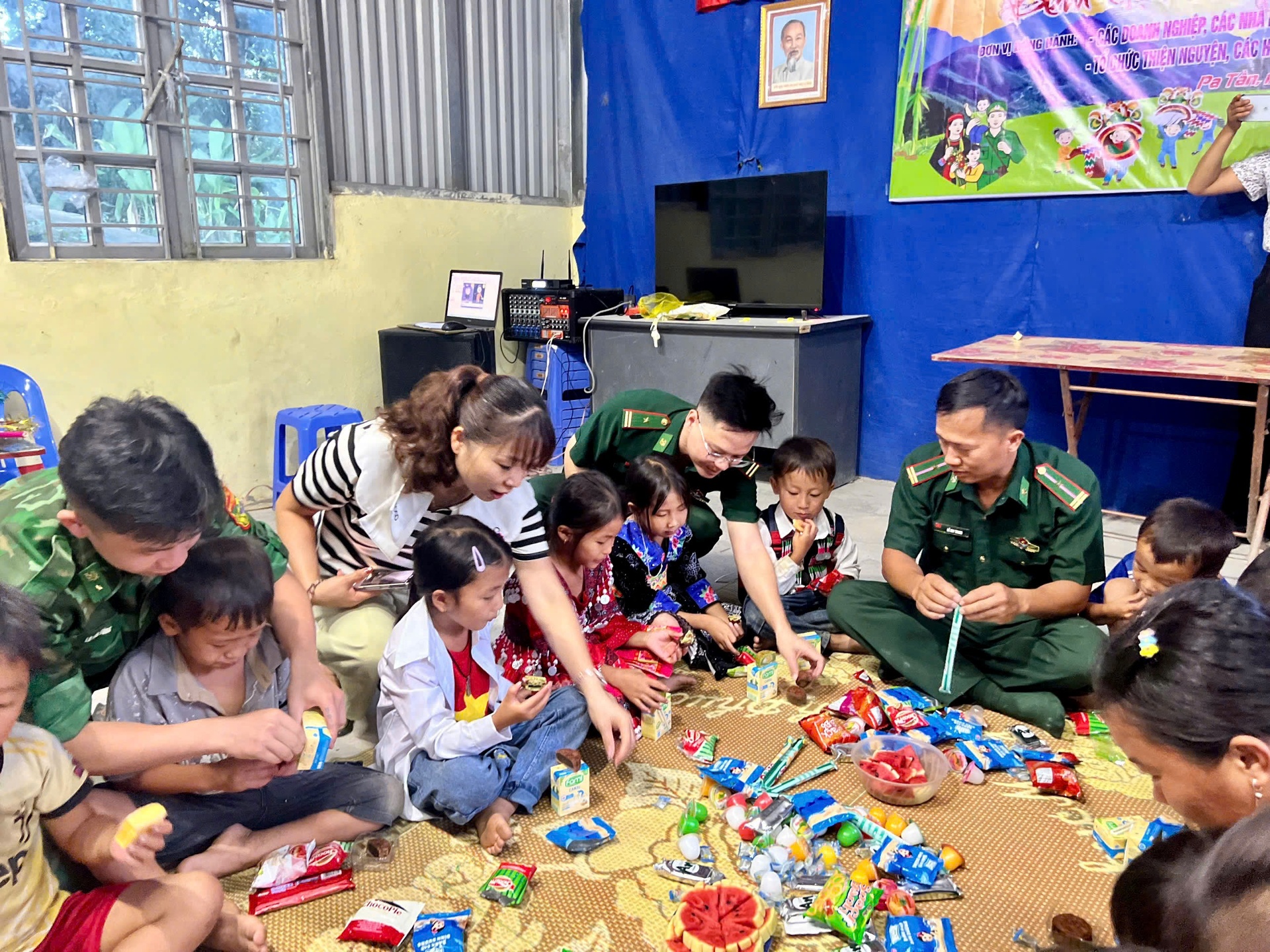 Cán bộ, chiến sĩ Đồn Biên phòng Pa Tần phát bánh kẹo cho các em.