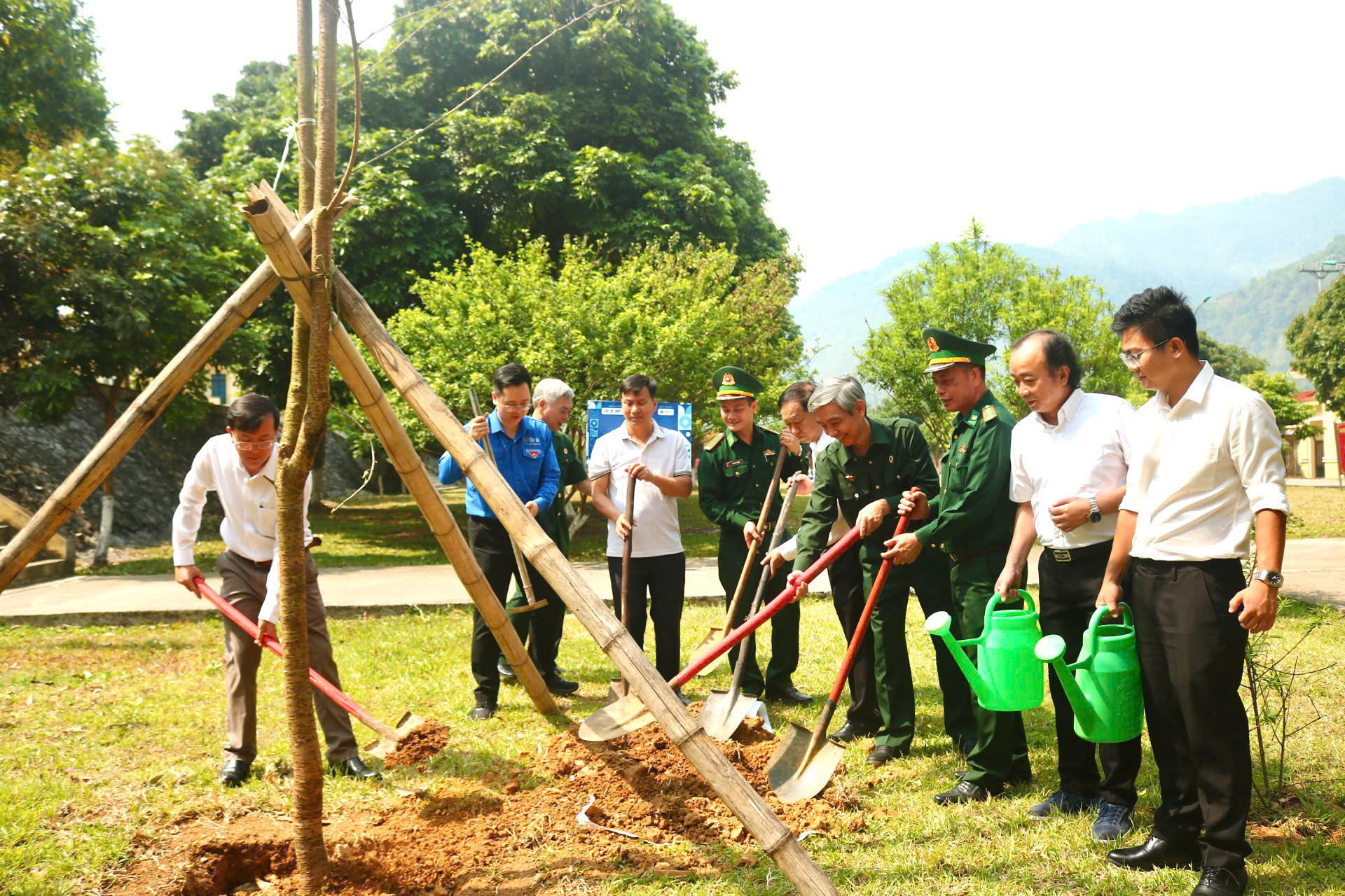 Đại diện đoàn công tác, đại diện lãnh đạo xã và Đồn Biên phòng Pa Tần thực hiện trồng cây lưu niệm trong khuôn viên đồn.