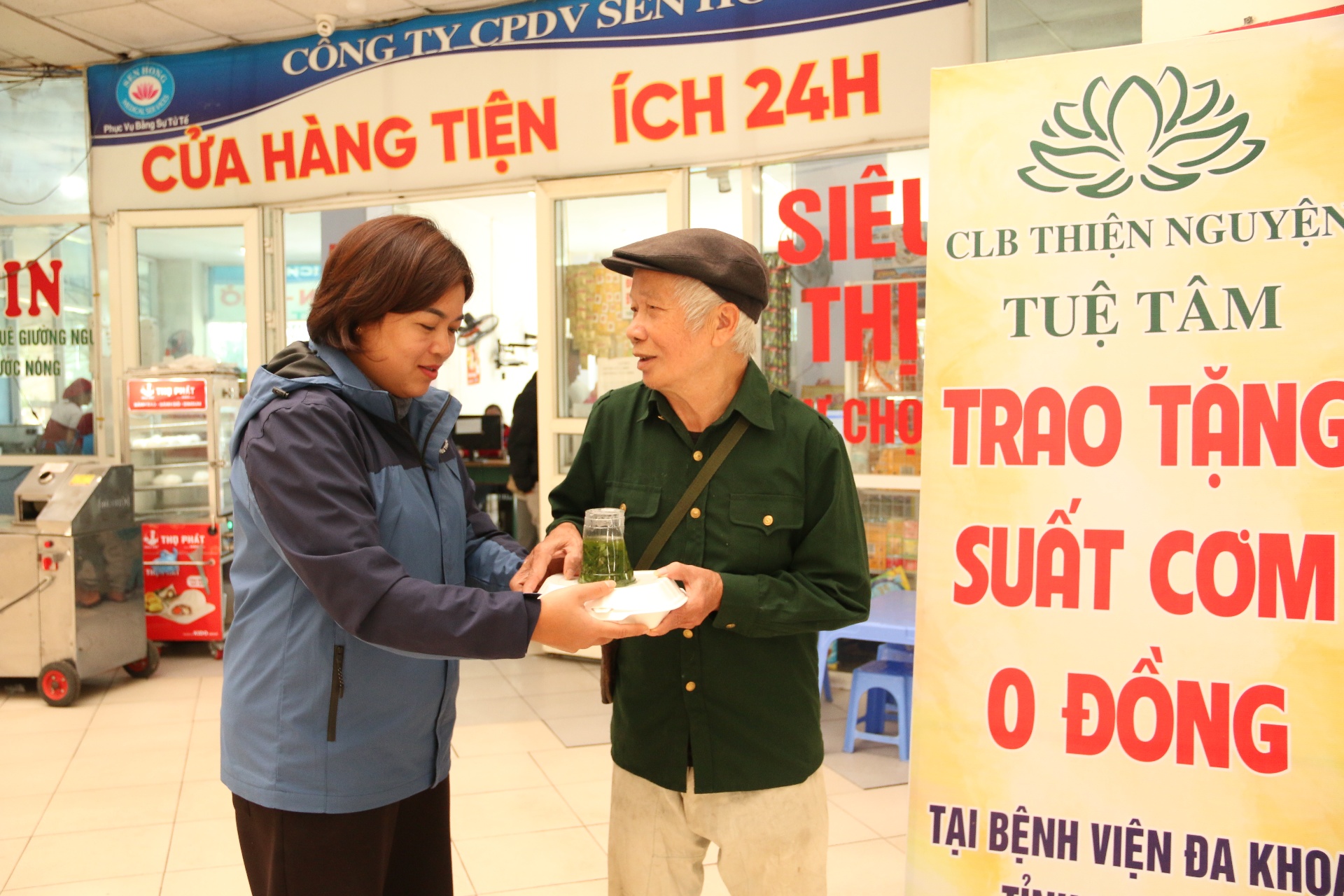 Thành viên Câu lạc bộ thiện nguyện Tuệ Tâm trao những suất cơm trưa 0 đồng tại Bệnh viện Đa khoa tỉnh.