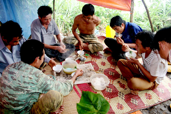 Một nồi cơm đầy kênh vung nhưng thức ăn chỉ có muối trắng, ớt ngâm và một bát canh nấu từ mì tôm với vài cọng rau là tất cả những gì “Lọ mọ” có để tái tạo sức lao động. Mấy manh quần áo cũ mèm bết đất lò vàng, những đôi dép vá chằng vá chịt là những gì họ vận lên thân. Một mảnh đất bằng, vài tấm nilon và những cây rừng là nơi ăn - ngủ lý tưởng. Tất cả thời gian “Lọ mọ” chỉ dành cho hầm vàng...
