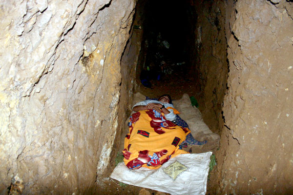 | Không bảo hiểm, không bảo hộ, dân vàng “lọ mọ” thường đu mình trên những trần hang tìm vàng. |