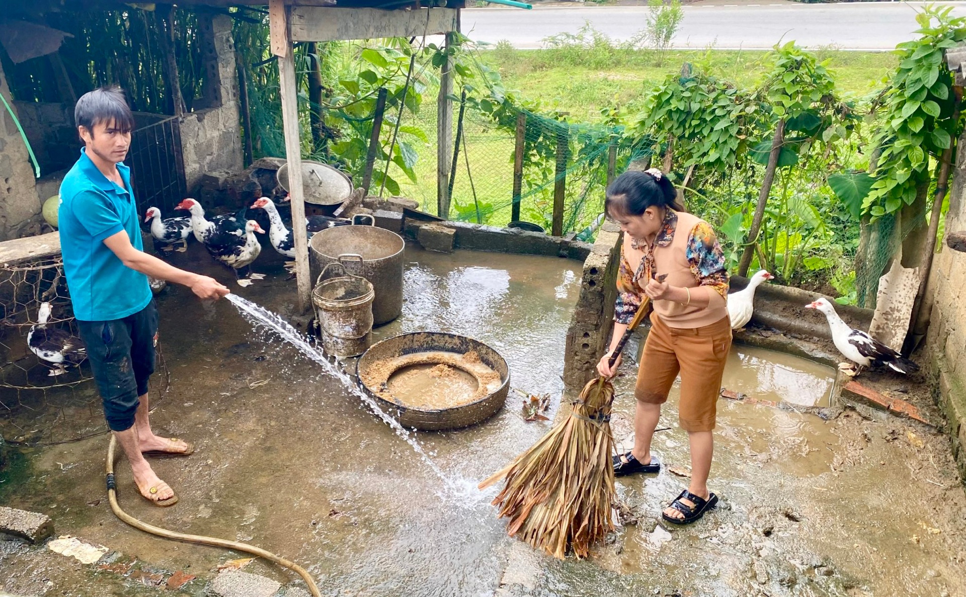 Vợ chồng anh Lò Văn Ín cùng dọn vệ sinh khu vực chăn nuôi.