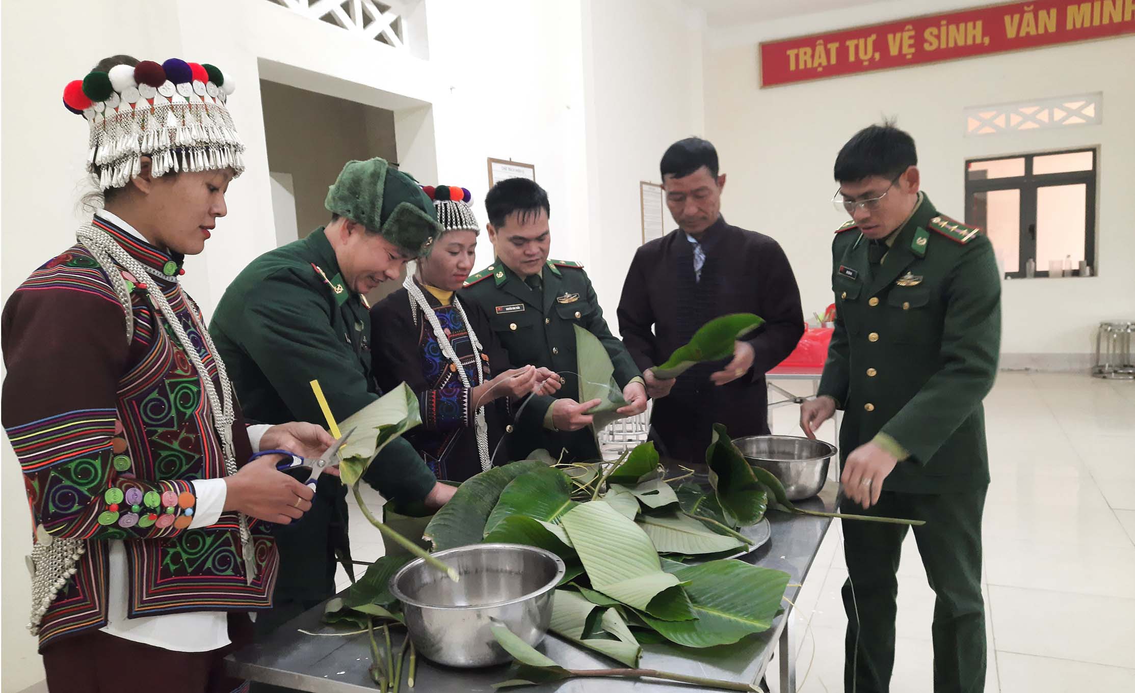 Cán bộ Đồn Biên phòng Sì Lở Lầu cùng Nhân dân gói bánh chưng chuẩn bị tết.