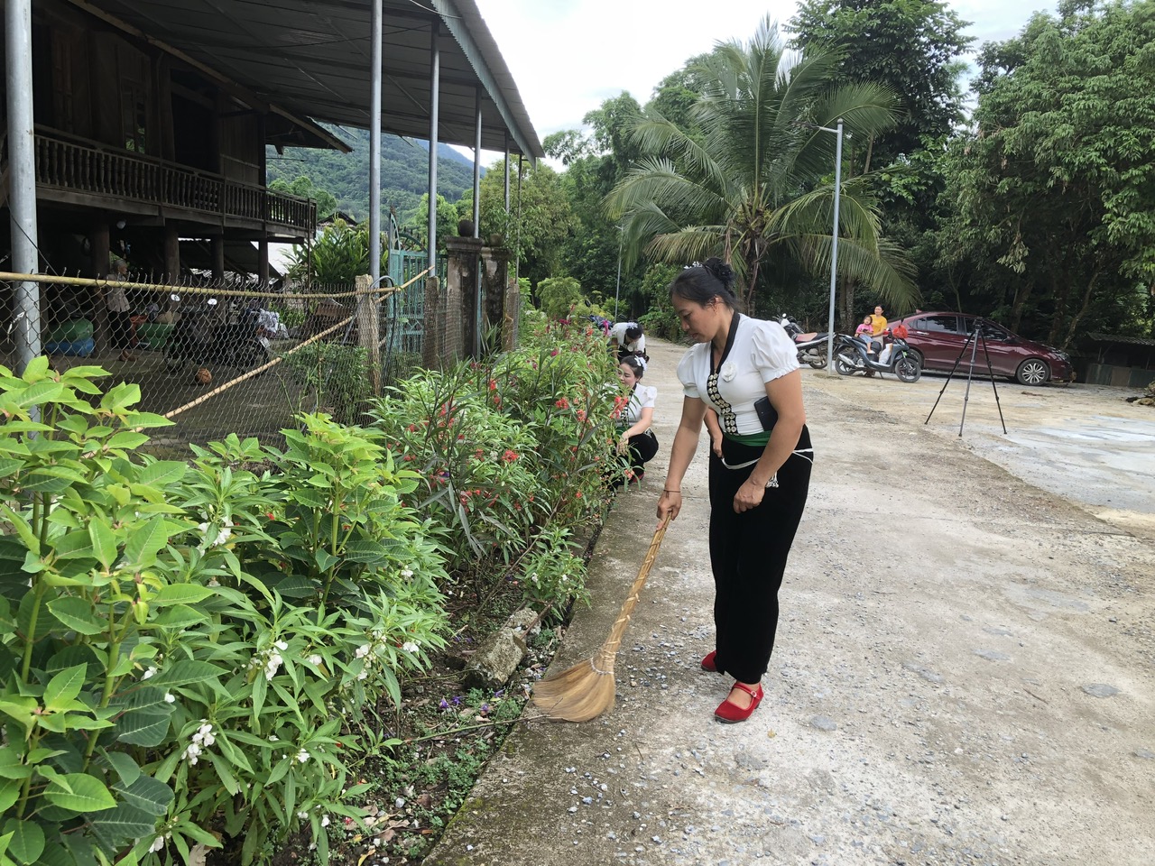 Chị em phụ nữ tham gia dọn vệ sinh đường bản.
