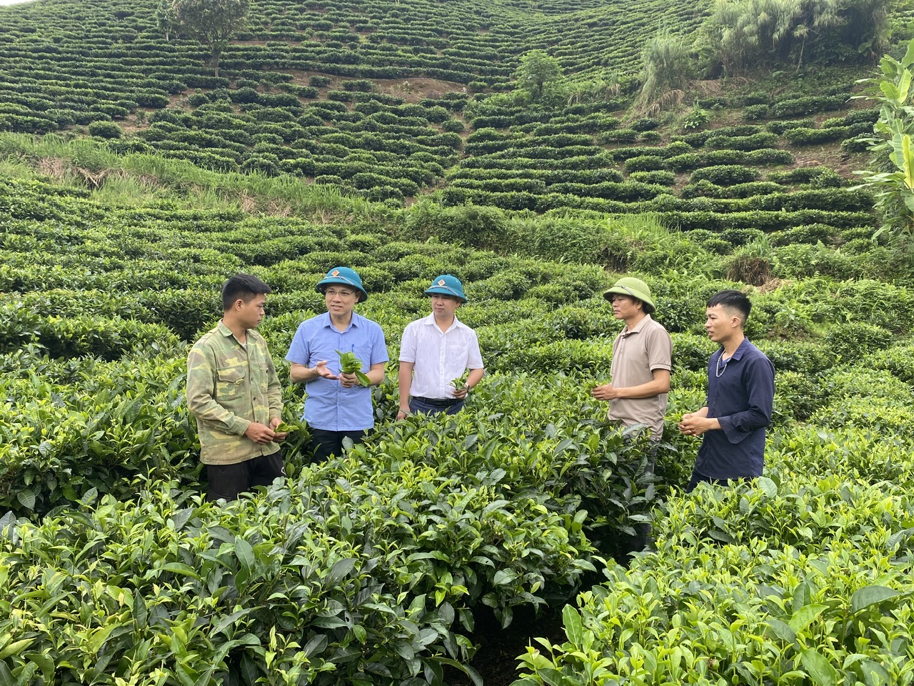 Lãnh đạo xã Hồng Thu cùng công chức Phòng Kinh tế xã đồng hành với người dân trong chăm sóc, thu hái chè, nâng cao giá trị cây trồng.