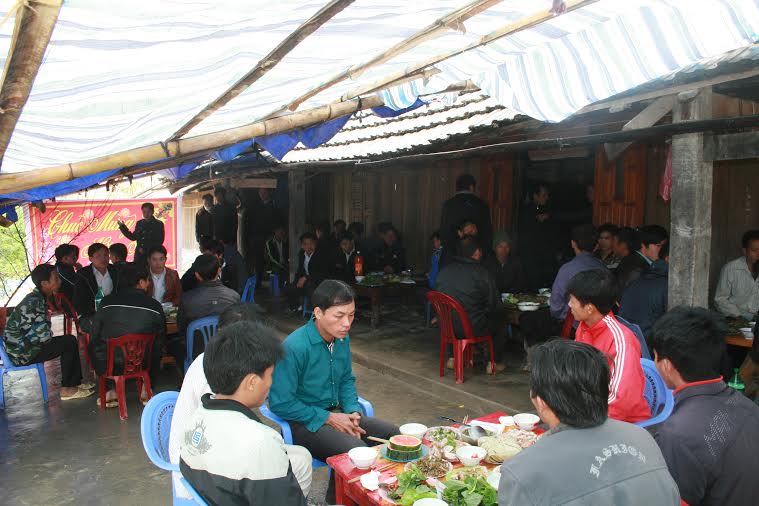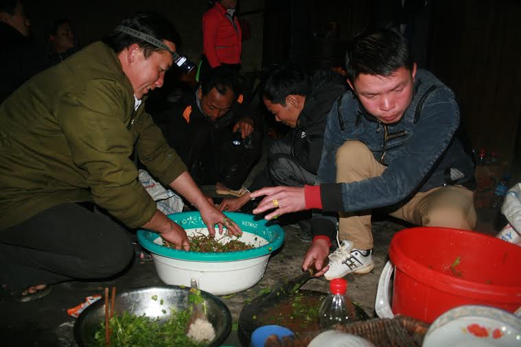 Nhà ông Giàng Páo Ly – Bí thư Chi bộ, một người rất có uy tín trong bản được chọn là nơi tổ chức ăn tết cho đồng bào. Khi chúng tôi đến mọi phần chuẩn bị đã gần như hoàn tất. Lợn đã mổ xong và thịt đã được chế biến thành các món ăn, bánh chưng đang bóc, dưa hấu đang pha, cành đào cũng đã được đưa vào vị trí trang trọng để nhân thêm không khí ngày xuân. Dù trời mưa, mất điện nhưng những đầu bếp là cán bộ, chiến sỹ bộ đội biên phòng và bà con dân bản vẫn rất trách nhiệm, nhiệt tình và khẩn trương chuẩn bị cỗ.