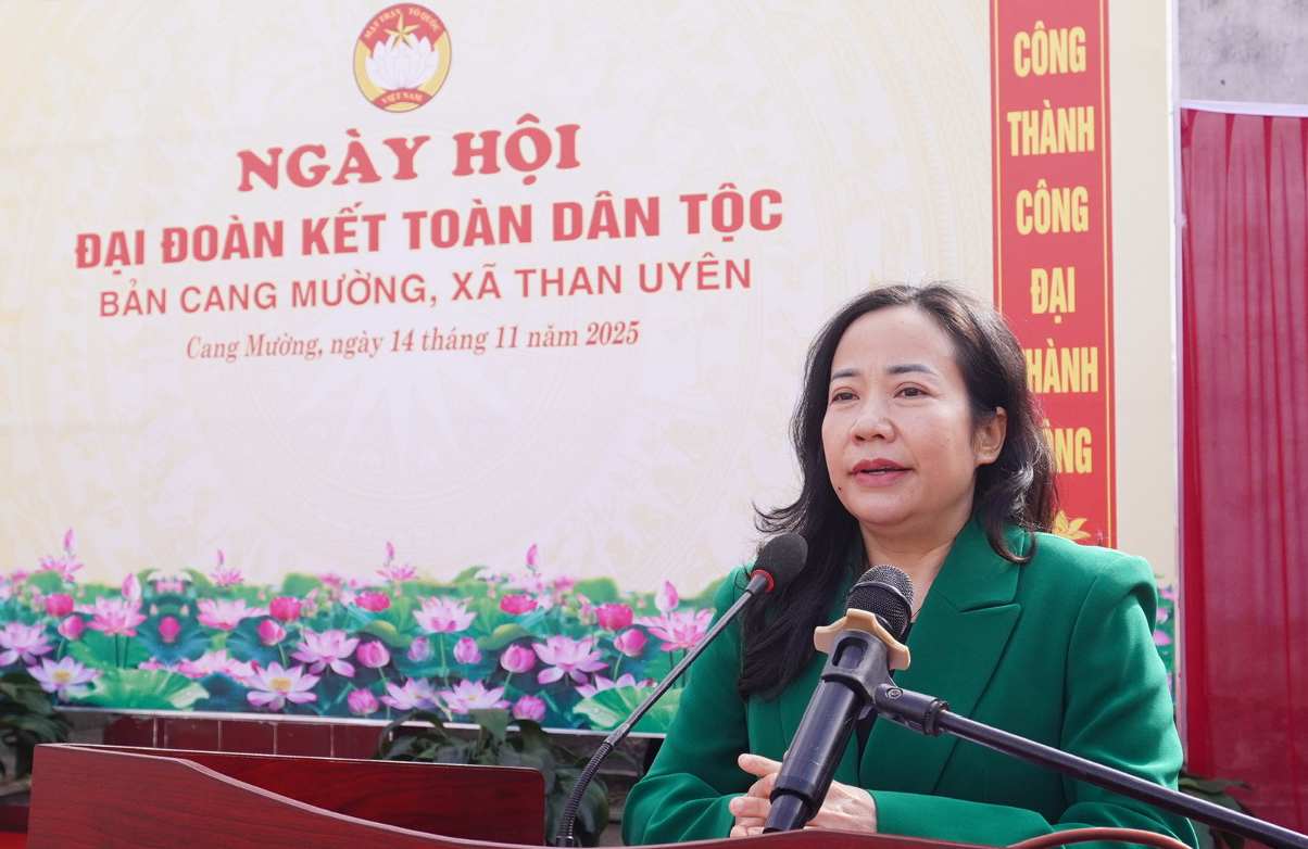 Phát biểu tại ngày hội, đồng chí Tẩn Thị Quế - Ủy viên Ban Thường vụ Tỉnh ủy, Trưởng Ban Dân tộc, HĐND tỉnh khẳng định những kết quả bản Cang Mường đạt được trong năm qua là minh chứng cho sự đoàn kết, đồng lòng, trách nhiệm của cán bộ và mỗi người dân trong bản đã phát huy sức mạnh đại đoàn kết, thi đua hoàn thành tốt các mục tiêu phát triển kinh tế - xã hội, nâng cao đời sống nhân dân.