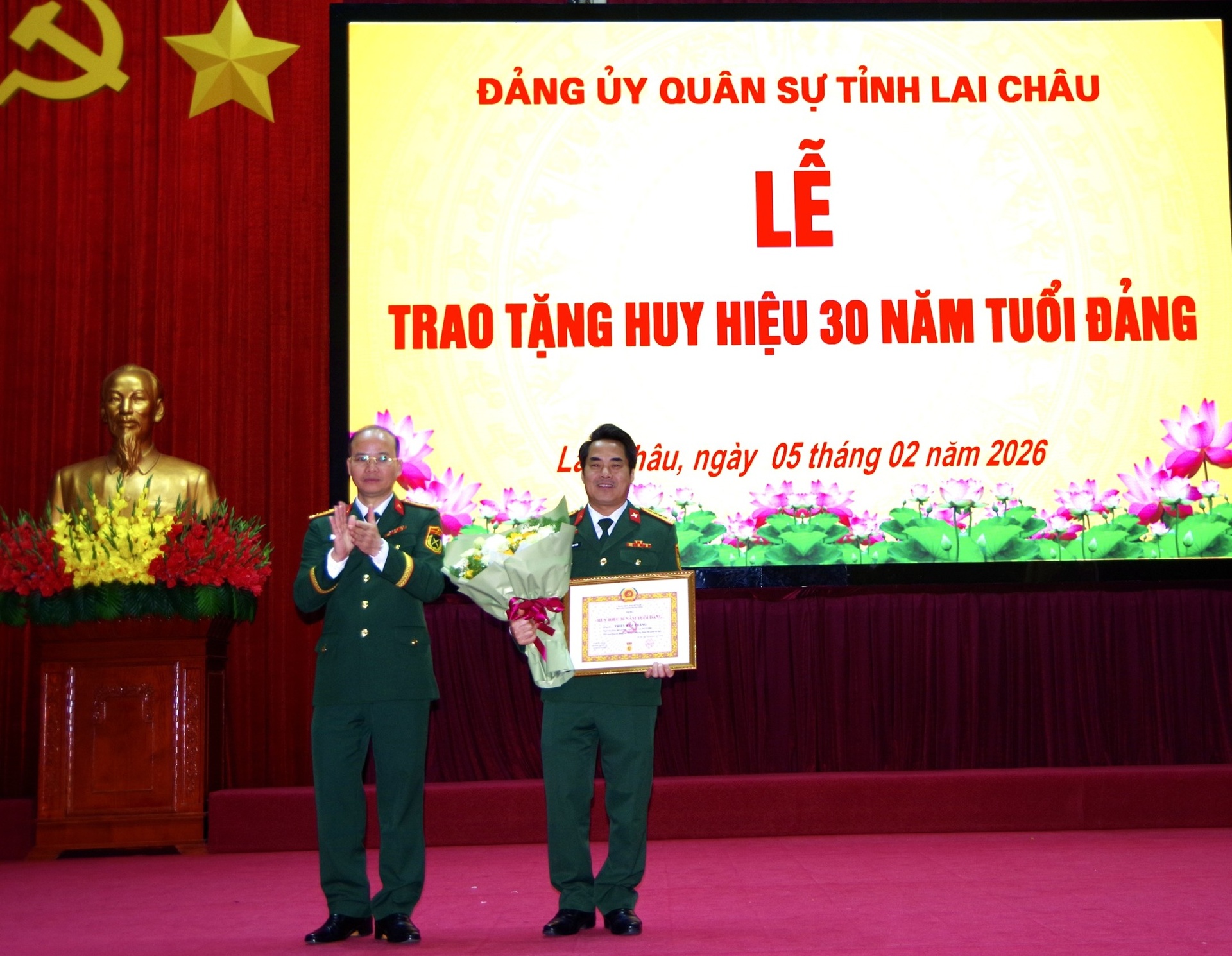 Sáng 5/2, Đảng ủy Bộ Chỉ huy Quân sự (CHQS) tỉnh Lai Châu tổ chức Lễ trao Huy hiệu 30 năm tuổi Đảng cho đồng chí Triệu Kim Thắng - Tỉnh ủy viên, Phó Bí thư Thường trực Đảng ủy Quân sự tỉnh, Chính ủy Bộ CHQS tỉnh Lai Châu. Dự buổi lễ có các đồng chí trong Thường vụ Đảng ủy, Thủ trưởng Bộ CHQS tỉnh; đại diện các cơ quan, đơn vị trực thuộc cùng cán bộ, đảng viên trong toàn Đảng bộ.