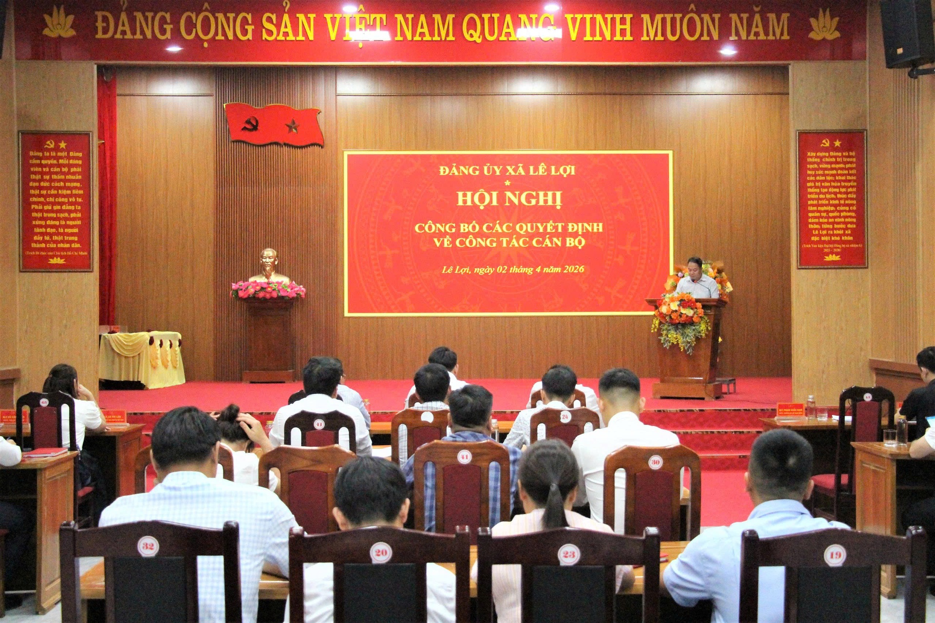 Đảng ủy xã Lê Lợi vừa tổ chức Hội nghị công bố các quyết định về công tác cán bộ. Đồng chí Nguyễn Ngọc Kiệm - Phó Bí thư Thường trực Đảng ủy dự và phát biểu giao nhiệm vụ. Cùng dự có đồng chí Đinh Quang Hiếu - Phó Bí thư, Chủ tịch UBND xã; các đồng chí trong Ban Thường vụ Đảng ủy, lãnh đạo HĐND, UBND, UB MTTQ xã và một số phòng chuyên môn.