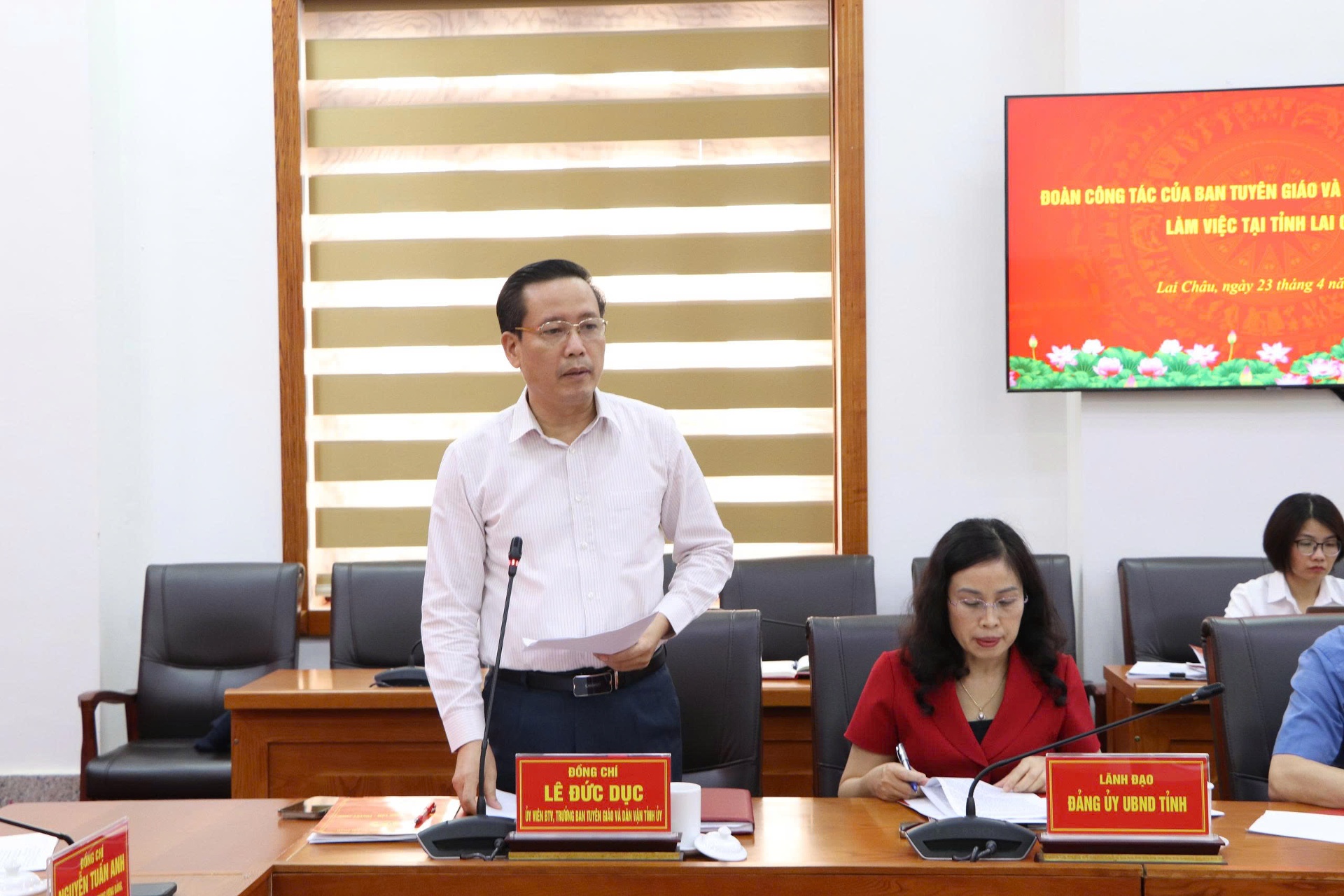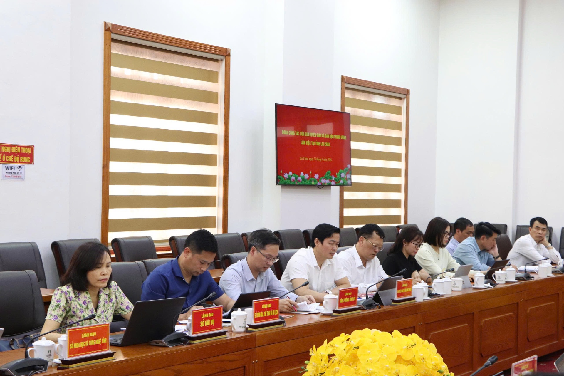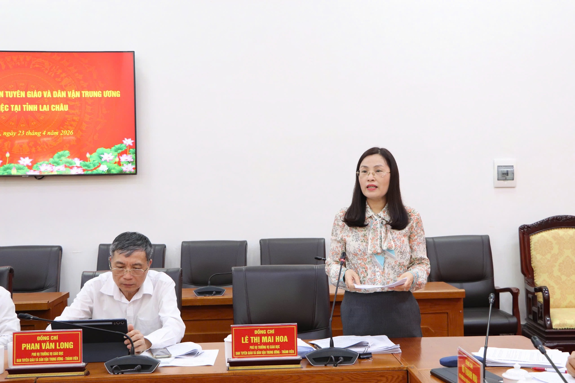Các đồng chí: Nguyễn Tuấn Anh - Ủy viên dự khuyết Ban Chấp hành Trung ương Đảng, Phó Bí thư Thường trực Tỉnh ủy; Vũ Thanh Mai - Phó Trưởng Ban TG&DV Trung ương đồng chủ trì buổi làm việc. Dự còn có Đồng chí Lê Đức Dục - Ủy viên Ban Thường vụ, Trưởng Ban TG&DV Tỉnh ủy Lai Châu; đại diện các vụ thuộc Ban TG&DV Trung ương, các sở, ban, ngành tỉnh.