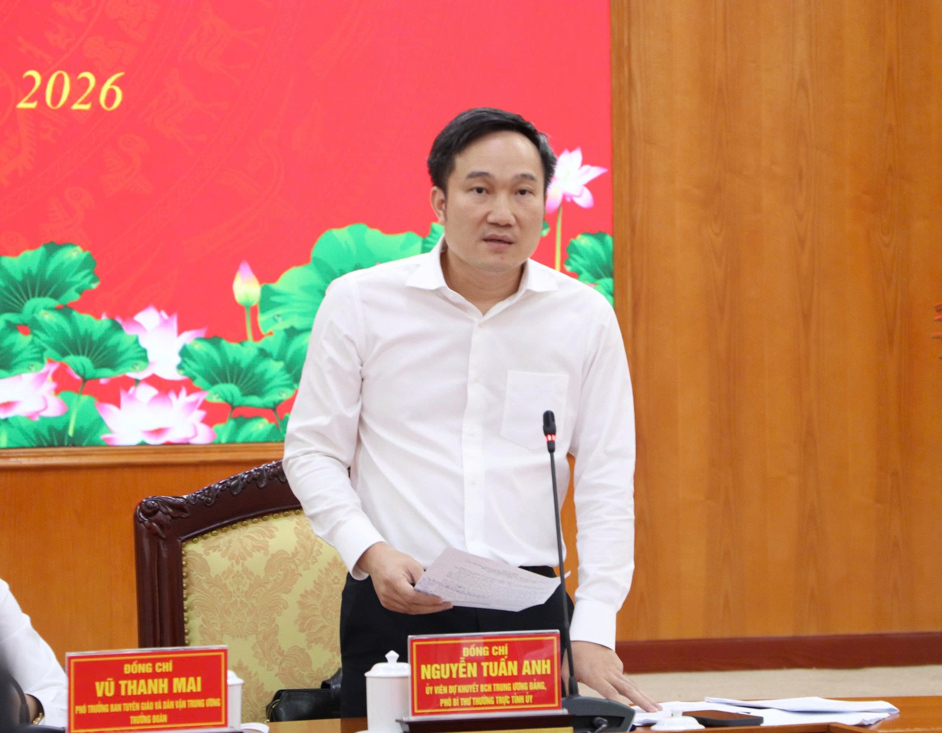 Phát biểu kết luận, đồng chí Nguyễn Tuấn Anh - Phó Bí thư Thường trực Tỉnh ủy trân trọng cảm ơn và tiếp thu đầy đủ các ý kiến đóng góp tâm huyết của thành viên đoàn công tác. Đồng thời, mong muốn trong thời gian tới, Trung ương tiếp tục quan tâm, hỗ trợ và đồng hành với tỉnh trên các lĩnh vực, góp phần thúc đẩy sự phát triển toàn diện của tỉnh.