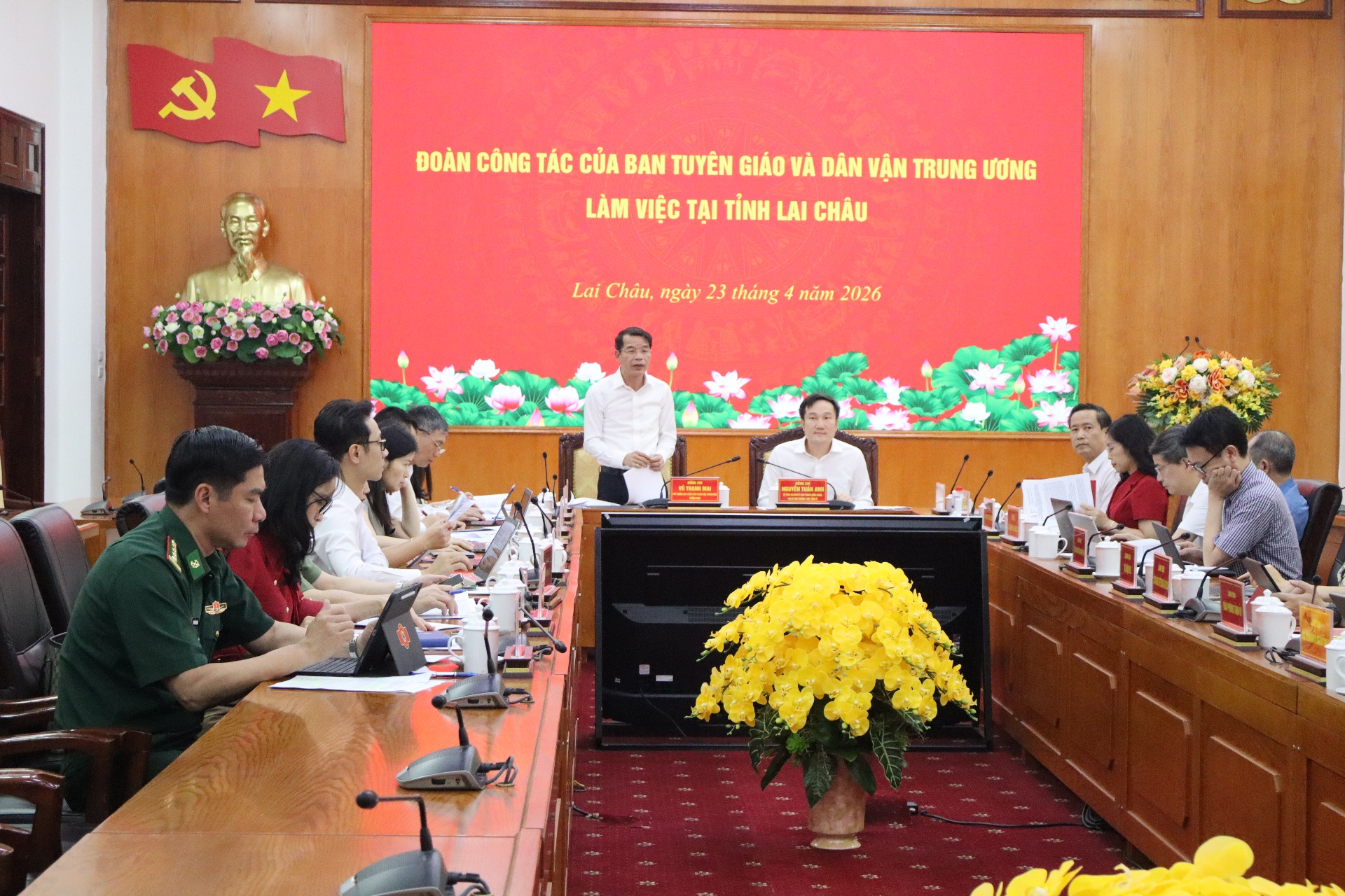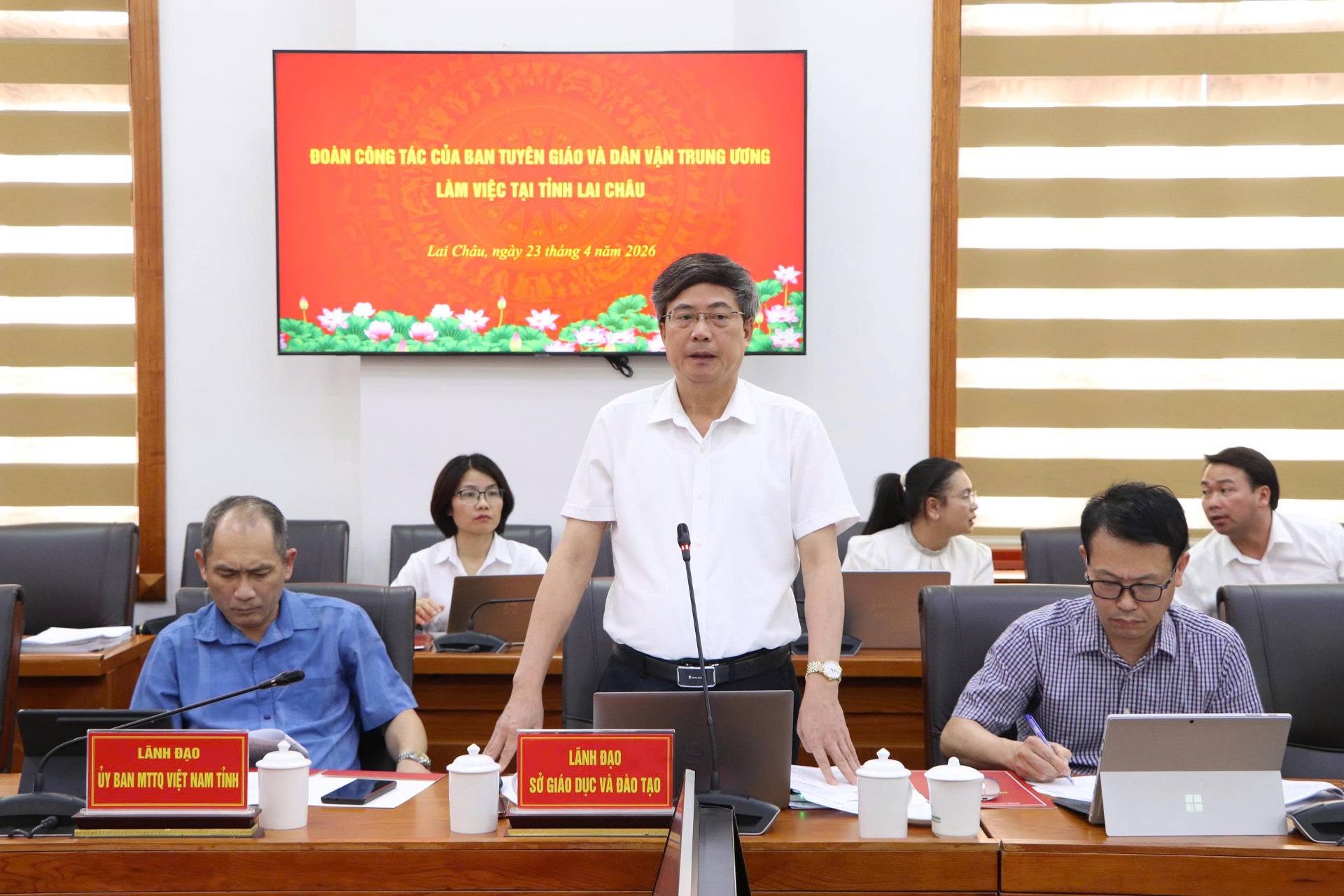 Chiều 23/4, Đoàn công tác của Ban Tuyên giáo và Dân vận (TG&DV) Trung ương làm việc với tỉnh Lai Châu về tình hình triển khai thực hiện Chỉ thị số 29-CT/TW, ngày 5/1/2024 của Bộ Chính trị về công tác phổ cập giáo dục, giáo dục bắt buộc, xóa mù chữ cho người lớn và đẩy mạnh phân luồng học sinh trong giáo dục phổ thông; Nghị quyết số 71-NQ/TW, ngày 22/8/2025 của Bộ Chính trị về đột phá phát triển giáo dục và đào tạo (GD&ĐT) và Nghị quyết số 57-NQ/TW, ngày 22/12/2024 của Bộ Chính trị về đột phá phát triển khoa học, công nghệ, đổi mới sáng tạo và chuyển đổi số quốc gia.