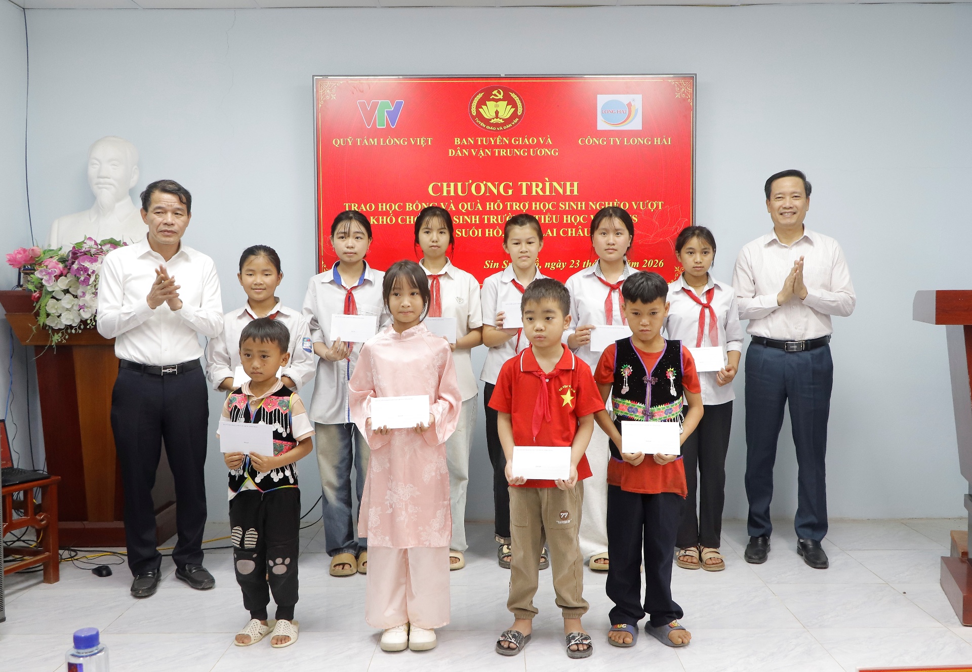 Dịp này, đoàn công tác đã trao tặng 10 suất học bổng và 200 suất quà cho học sinh Trường Tiểu học và THCS xã Sin Suối Hồ.