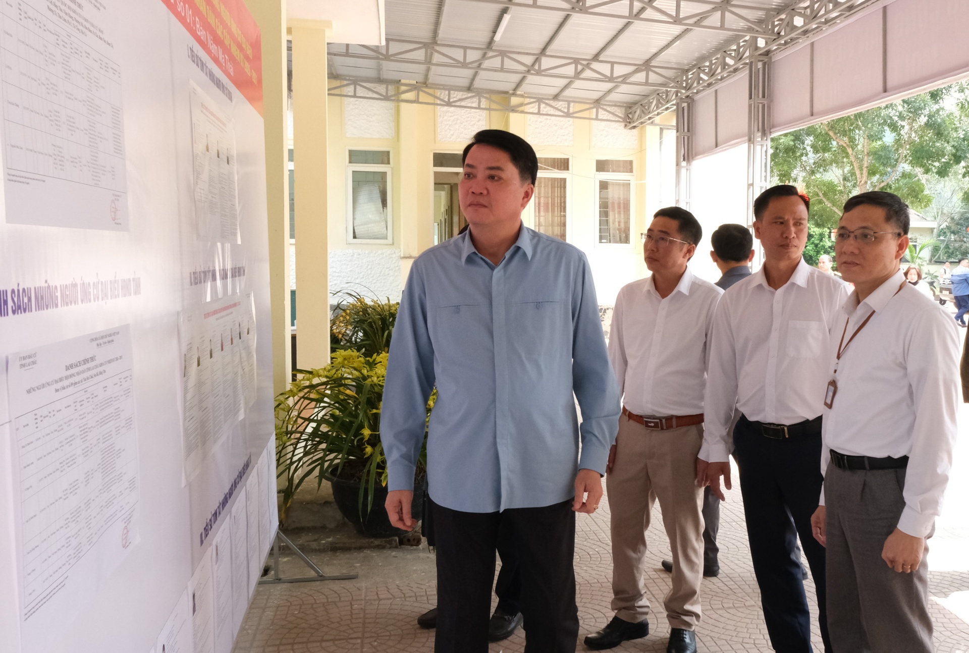 Đoàn kiểm tra xem danh sách cử tri được niêm yết tại trụ sở xã Hồng Thu.