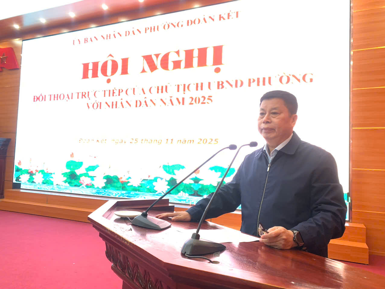Phát biểu kết luận tại hội nghị, đồng chí Hoàng Đại Thắng - Chủ tịch UBND phường Đoàn Kết khẳng định: Hội nghị đối thoại trực tiếp giữa người đứng đầu chính quyền UBND phường với nhân dân là hoạt động được thực hiện thường niên, nhằm thực hiện quy chế dân chủ ở cơ sở. Đây là dịp để cấp ủy, chính quyền lắng nghe tâm tư, nguyện vọng, ý kiến đóng góp của nhân dân; đồng thời, trực tiếp trao đổi, giải đáp những vấn đề bà con quan tâm trong quá trình triển khai các chủ trương, chính sách của Đảng, pháp luật của Nhà nước và các nhiệm vụ phát triển kinh tế - xã hội ở địa phương.