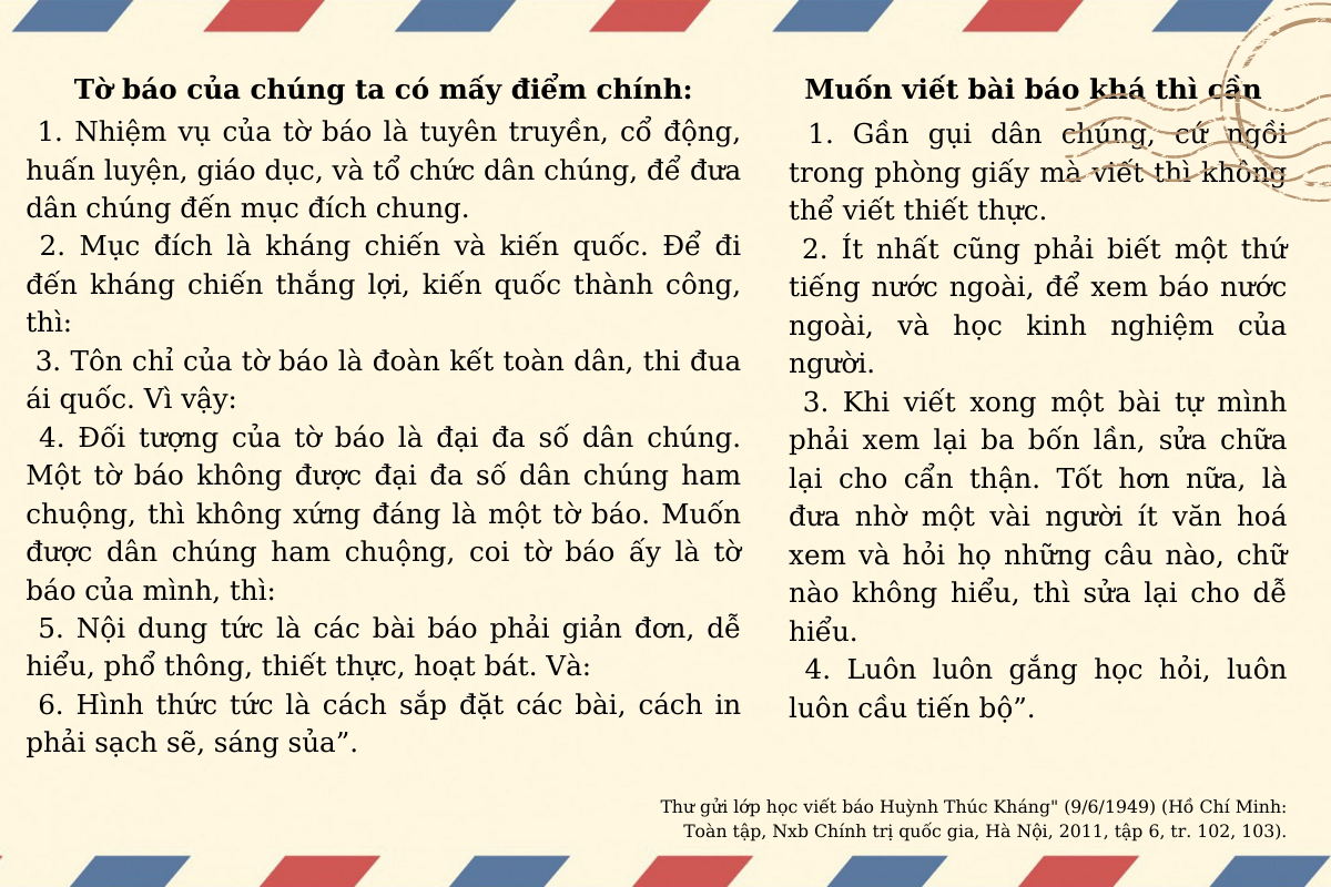 Tờ báo Đảng là như những lớp huấn luyện giản đơn, thiết thực và rộng khắp. Nó dạy bảo chúng ta những điều cần biết làm về tuyên truyền, tổ chức, lãnh đạo và công tác. Hằng ngày nó giúp nâng cao trình độ chính trị và năng suất công tác của chúng ta.Người nhấn mạnh.