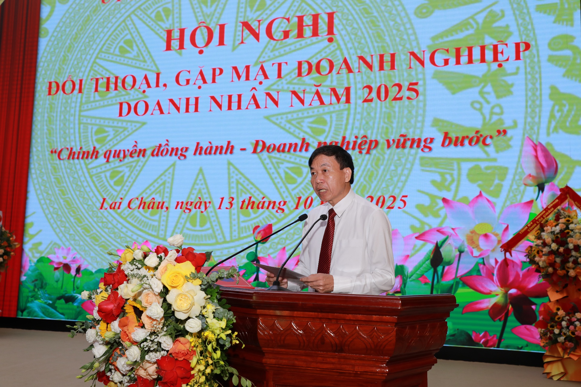 Phát biểu khai mạc hội nghị, đồng chí Lê Văn Lương - Phó Bí thư Tỉnh uỷ, Chủ tịch UBND tỉnh nhấn mạnh: Hội nghị là dịp để ôn lại chặng đường xây dựng và phát triển của doanh nghiệp, doanh nhân Việt Nam nói chung, doanh nghiệp, doanh nhân tỉnh Lai Châu nói riêng. Đánh giá tình hình sản xuất, kinh doanh năm 2025, nhiệm vụ trọng tâm năm 2026; đối thoại, trao đổi để tháo gỡ một số khó khăn, vướng mắc trong sản xuất kinh doanh. Với chủ đề “Chính quyền đồng hành - doanh nghiệp vững bước”, đồng chí Chủ tịch UBND tỉnh mong muốn hội nghị sẽ là diễn đàn trao đổi sôi nổi, cởi mở và hiệu quả, vì vậy, đề nghị các đại biểu và doanh nghiệp cùng trao đổi, thảo luận những vấn đề còn đang vướng mắc, kiến nghị, đề xuất đối với chính quyền để sau hội nghị, các vướng mắc, kiến nghị của doanh nghiệp sẽ được ghi nhận và giải quyết kịp thời, tạo động lực để doanh nghiệp phát triển, đóng góp quan trọng vào sự phát triển của tỉnh trong thời gian tới.