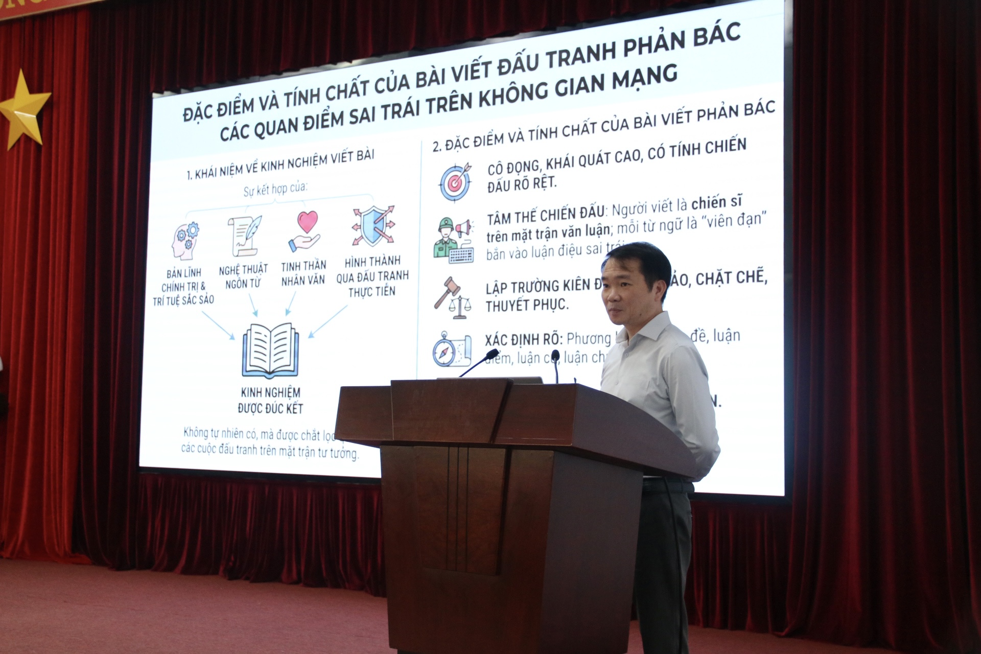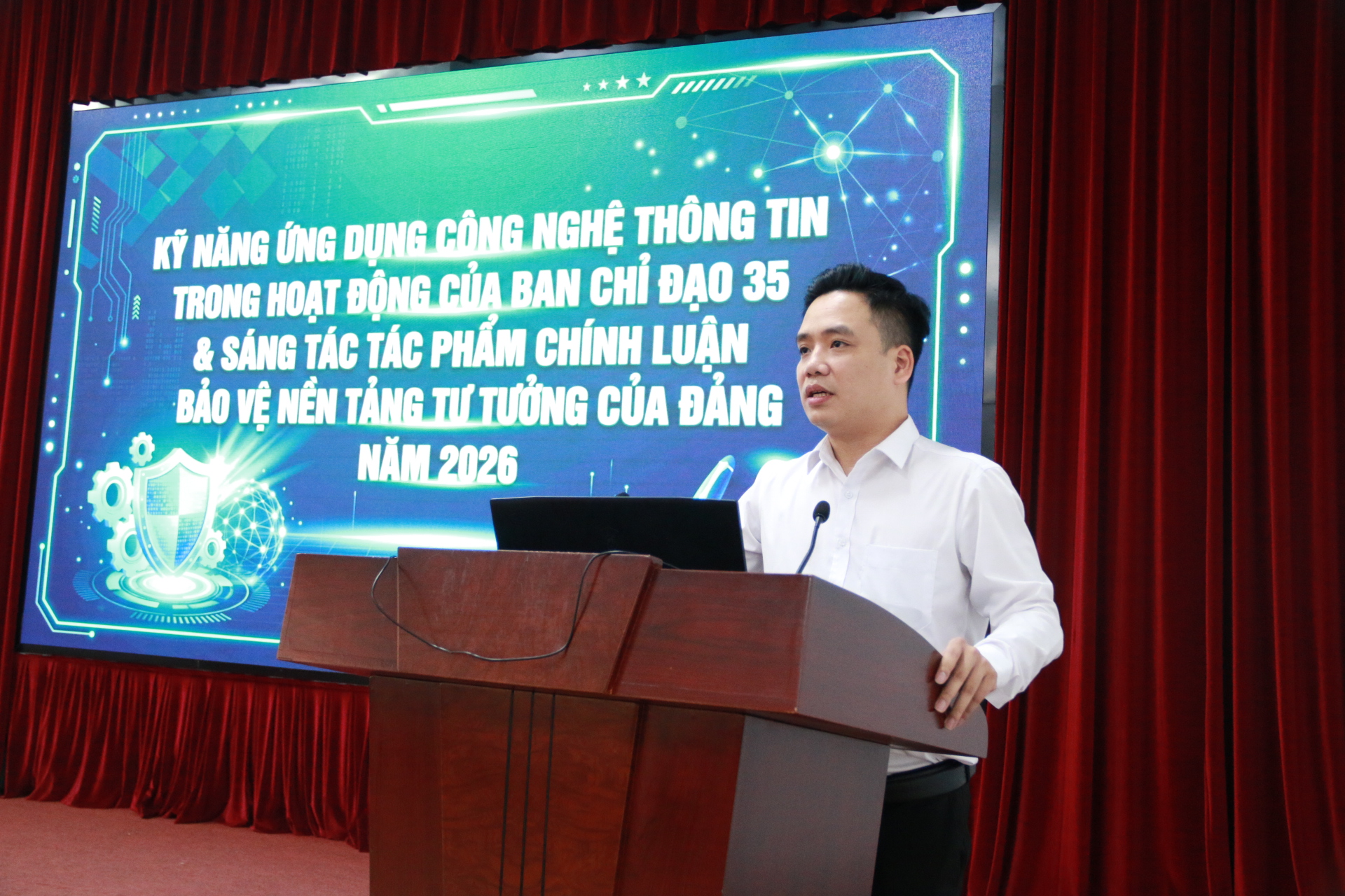 Tại hội nghị, đại biểu được truyền đạt 3 chuyên đề trọng tâm: Kỹ năng viết tin, bài tuyên truyền, đấu tranh phản bác các quan điểm sai trái, thù địch; xử lý các tình huống thường gặp trong quá trình đấu tranh trên không gian mạng; kinh nghiệm và kỹ năng thực hành xây dựng các tác phẩm chính luận tham gia Cuộc thi về bảo vệ nền tảng tư tưởng của Đảng năm 2026; một số lưu ý về kỹ năng sử dụng công nghệ thông tin trong hoạt động của BCĐ 35, cộng tác viên BCĐ 35 và trong xây dựng bài thi chính luận bảo vệ nền tảng tư tưởng của Đảng.