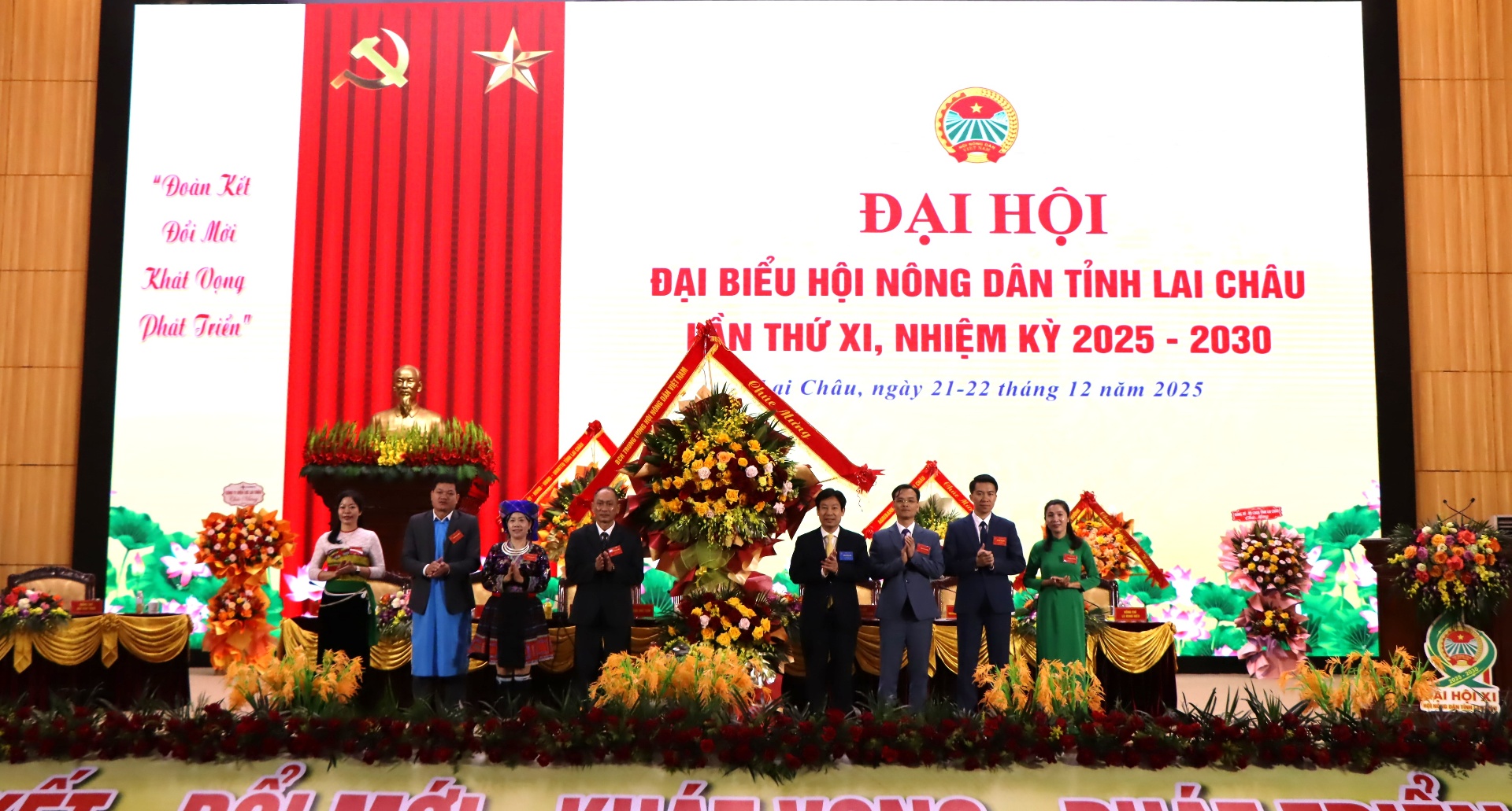 Các đồng chí: Sùng A Hồ - Phó Bí thư Thường trực Tỉnh ủy, Chủ tịch Ủy ban MTTQ Việt Nam tỉnh; Nguyễn Xuân Định - Phó Chủ tịch Trung ương Hội Nông dân Việt Nam tặng hoa chúc mừng Ban Chấp hành Hội nông dân tỉnh Lai Châu khóa XI, nhiệm kỳ 2025-2030.