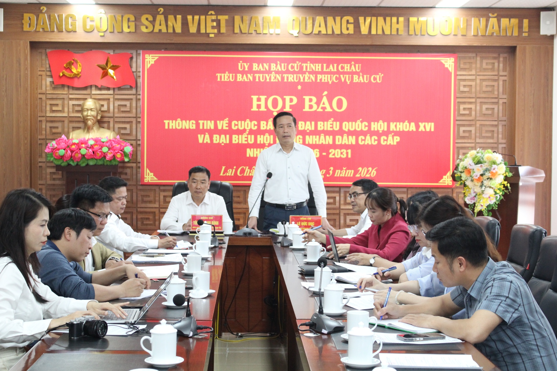 Chiều 3/3, Tiểu Ban tuyên truyền phục vụ bầu cử - Uỷ ban Bầu cử tỉnh Lai Châu tổ chức Họp báo thông tin về cuộc bầu cử đại biểu Quốc hội khóa XVI và đại biểu HĐND các cấp nhiệm kỳ 2026-2031. Các đồng chí Tống Thanh Bình - Uỷ viên Ban Thường vụ Tỉnh ủy, Phó Chủ tịch Thường trực Ủy ban MTTQ Việt Nam tỉnh, Phó Chủ tịch Ủy ban Bầu cử tỉnh; Lê Đức Dục - Uỷ viên Ban Thường vụ, Trưởng Ban Tuyên giáo và Dân vận Tỉnh ủy, Ủy viên Uỷ ban Bầu cử tỉnh, Trưởng Tiểu ban Tuyên truyền phục vụ bầu cử chủ trì họp báo.