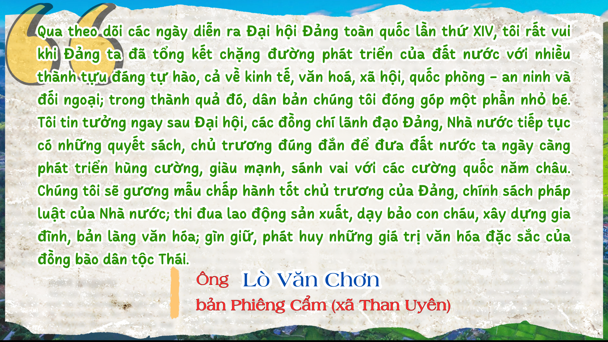 Chị Vừ Thị Mai Dinh - Phó Chủ tịch Ủy ban Mặt trận Tổ quốc Việt Nam tỉnh, Bí thư Tỉnh đoàn khẳng định: Trong thời gian qua, các cấp bộ đoàn trong tỉnh đã triển khai nhiều phong trào thi đua, hoạt động xung kích, tình nguyện thiết thực, sôi nổi, phát huy vai trò của tuổi trẻ trong tham gia phát triển kinh tế - xã hội, bảo đảm quốc phòng - an ninh, an sinh xã hội trên địa bàn tỉnh. Đặc biệt, đoàn các cấp đã tổ chức nhiều chương trình, hoạt động ý nghĩa hướng về Đại hội Đại biểu toàn quốc lần thứ XIV của Đảng, thể hiện niềm tin, kỳ vọng và trách nhiệm của thế hệ trẻ đối với sự nghiệp xây dựng và phát triển đất nước. Sau thành công của Đại hội, tuổi trẻ Lai Châu mong muốn công tác đoàn và phong trào thanh, thiếu nhi cả nước nói chung, của tỉnh Lai Châu nói riêng sẽ tiếp tục có nhiều đổi mới, đột phá, đáp ứng yêu cầu nhiệm vụ trong giai đoạn phát triển mới. Đồng thời, tiếp tục nhận được sự quan tâm, lãnh đạo, chỉ đạo của các đồng chí lãnh đạo Đảng, Nhà nước, Trung ương Đoàn với những chủ trương, quyết sách phù hợp, tạo điều kiện để thanh niên phát huy tốt hơn vai trò xung kích, sáng tạo. Tuổi trẻ Lai Châu sẽ tiếp tục phát huy tinh thần xung kích, tình nguyện, tích cực tham gia các phong trào thi đua yêu nước, trọng tâm là các phong trào như: “Chung sức xây dựng nông thôn mới”, “Tuổi trẻ xung kích bảo vệ an ninh Tổ quốc”; đẩy mạnh huy động các nguồn lực xã hội hóa để chăm lo, hỗ trợ thiếu niên, nhi đồng, nhất là trẻ em có hoàn cảnh khó khăn, trẻ em mồ côi, góp phần xây dựng môi trường sống an toàn, lành mạnh và tạo điều kiện để các em được học tập, rèn luyện và phát triển toàn diện.