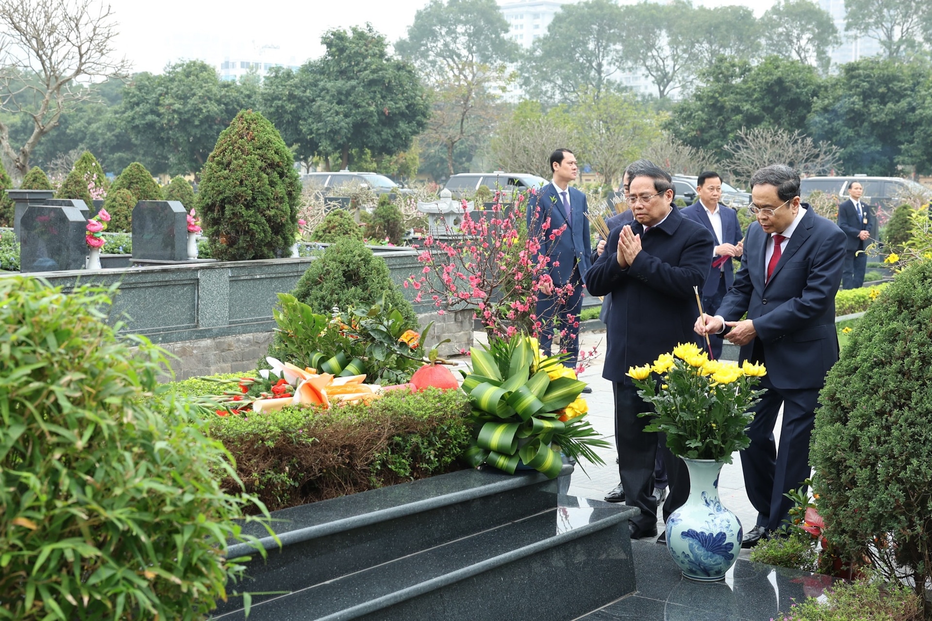 Thủ tướng Chính phủ Phạm Minh Chính, Chủ tịch Quốc hội Trần Thanh Mẫn dâng hương tưởng niệm các vị tiền bối cách mạng và Anh hùng liệt sĩ tại nghĩa trang Mai Dịch. Ảnh: Hải Nguyễn