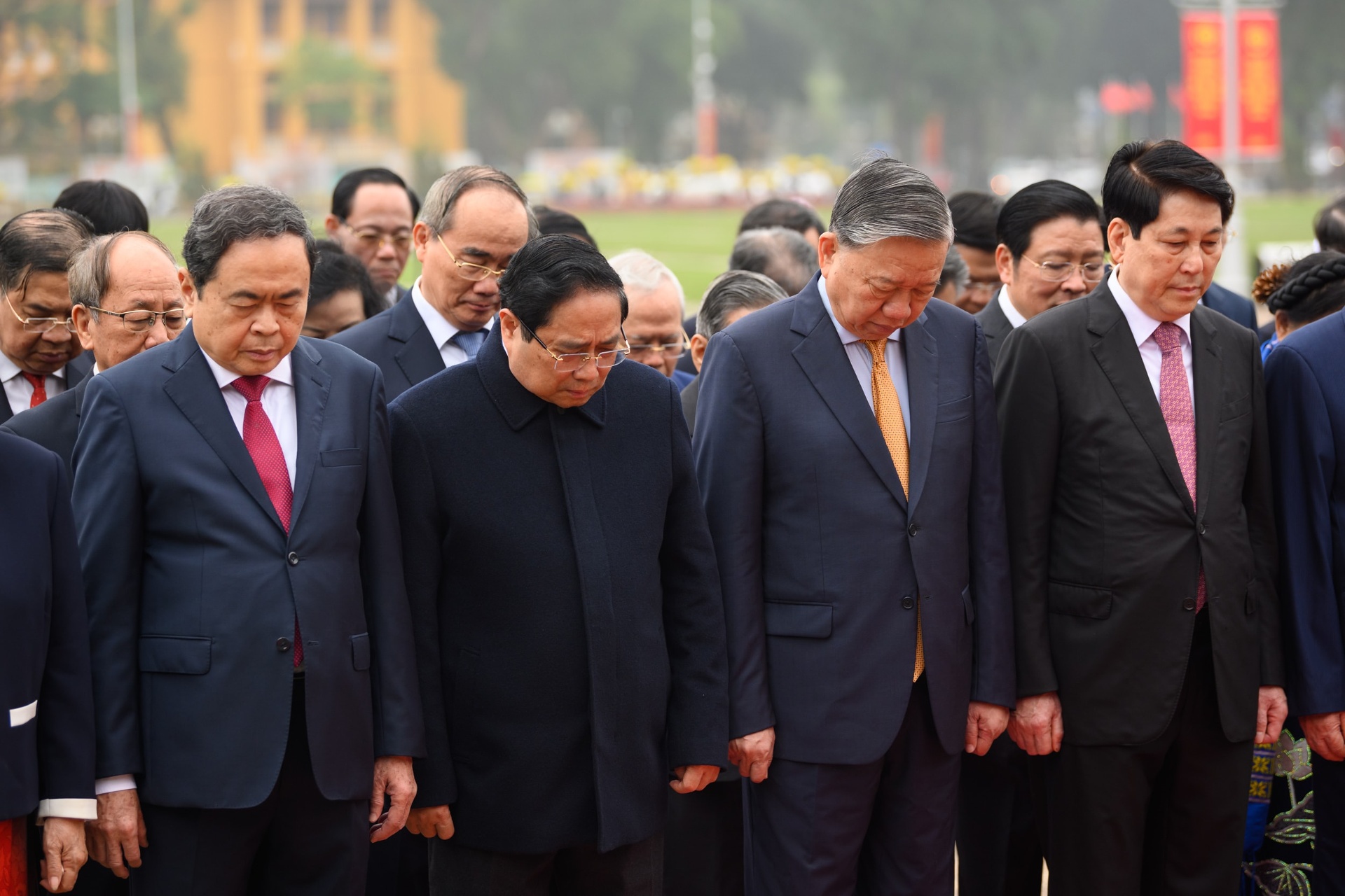 Đoàn đại biểu lãnh đạo, nguyên lãnh đạo Đảng, Nhà nước, Ủy ban Trung ương Mặt trận Tổ quốc Việt Nam vào Lăng viếng Chủ tịch Hồ Chí Minh. Ảnh: Phạm Thắng