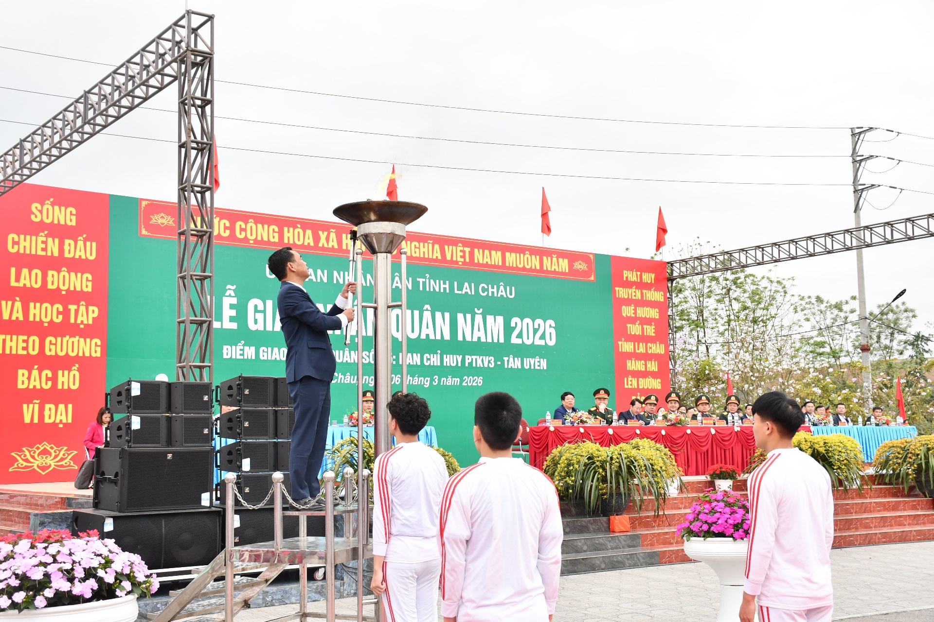 Tại buổi lễ đã diễn ra nghi thức chào cờ, tiếp lửa truyền thống và đánh trống khai hội tòng quân năm 2026.