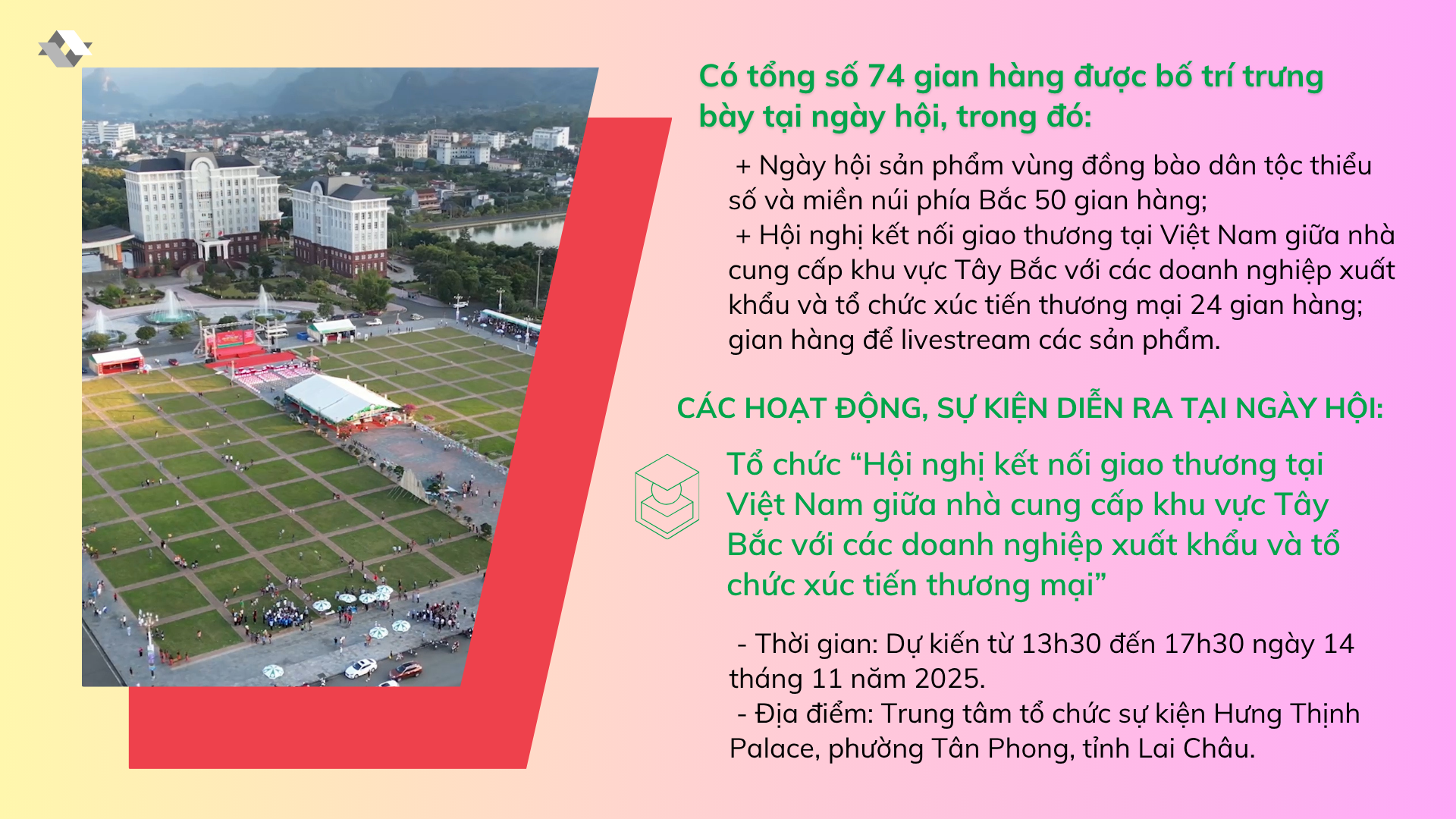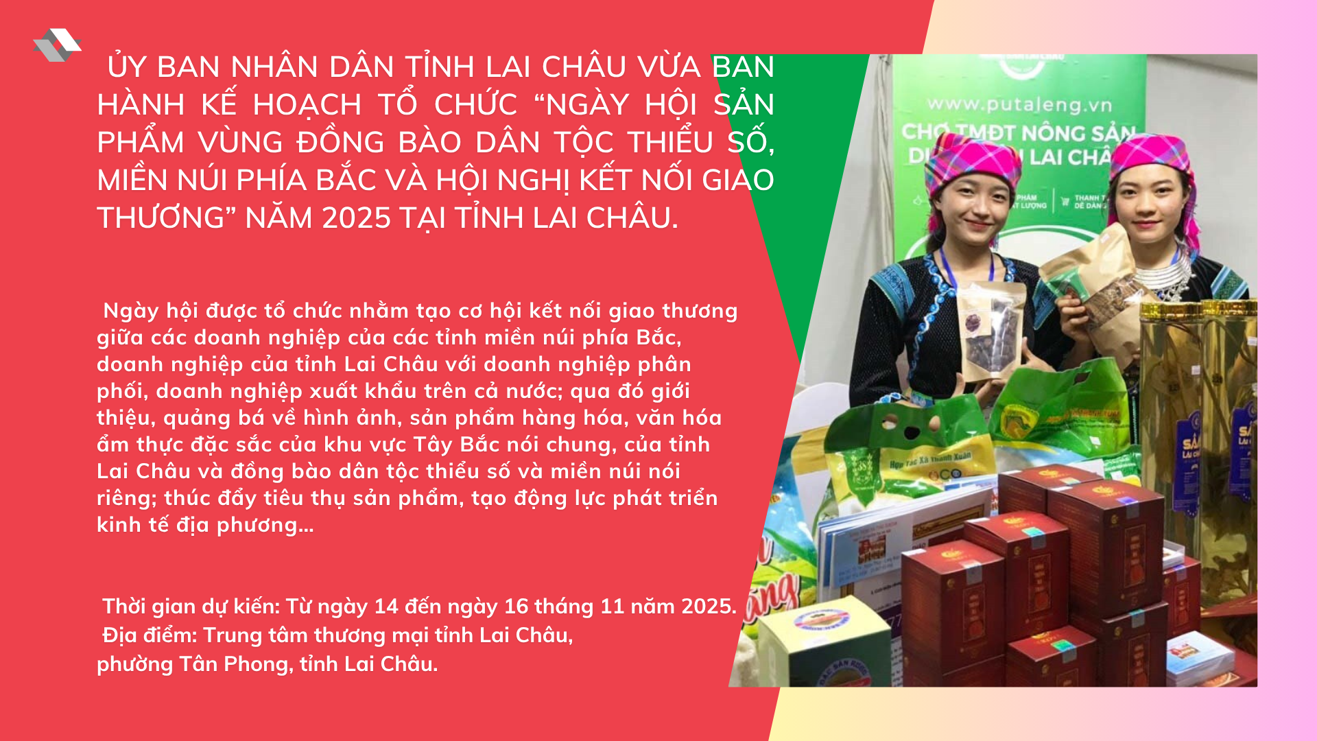 Ủy ban nhân dân tỉnh Lai Châu vừa ban hành Kế hoạch số 6632 /KH-UBND ngày 24/10/2025 tổ chức “Ngày hội sản phẩm vùng đồng bào dân tộc thiểu số, miền núi phía Bắc và Hội nghị kết nối giao thương” năm 2025 tại tỉnh Lai Châu.